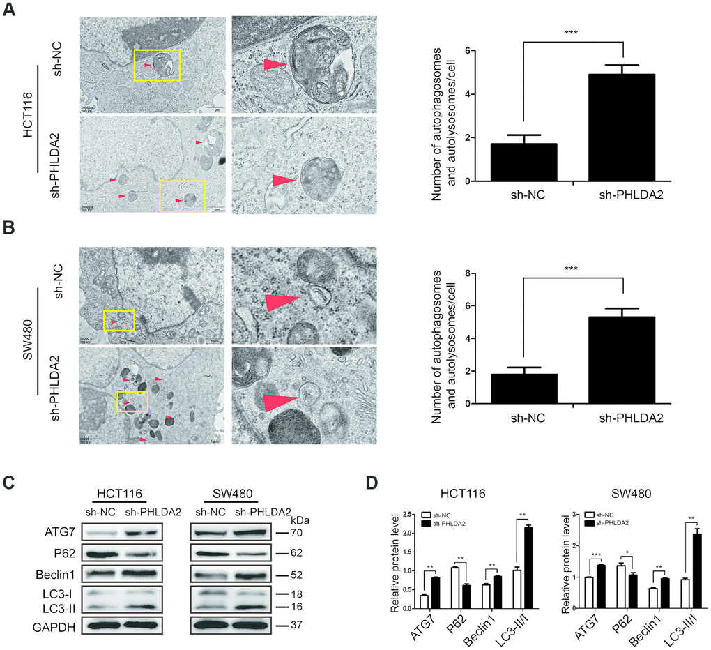 We found that PHLDA2 expression correlates negatively with apoptosis of CRC cells. Autophagy is a hallmark of cellular apoptosis; therefore, we assessed the effect of PHLDA2 on CRC cellular apoptosis. We used Transmission electron microscopy (TEM) to examine CRC cells and found stably-transfected with sh-PHLDA2 increased numbers of autophagosomes and autolysosomes in HCT116 (Figure 5A) and SW480 (Figure 5B) cells. Western blot analyses demonstrated an accumulation of ATG7, Beclin1, and lipid-bound LC3-II in cells with low PHLDA2 levels (Figure 5C, 5D), indicating an increase in the synthesis of autophagosomes. We also measured the levels of P62, a substrate of autophagy. As expected, inhibition of PHLDA2 decreased the expression of P62 protein (Figure 5C, 5D). Taken together, these results suggest that low PHLDA2 levels induce autophagy in CRC cells.