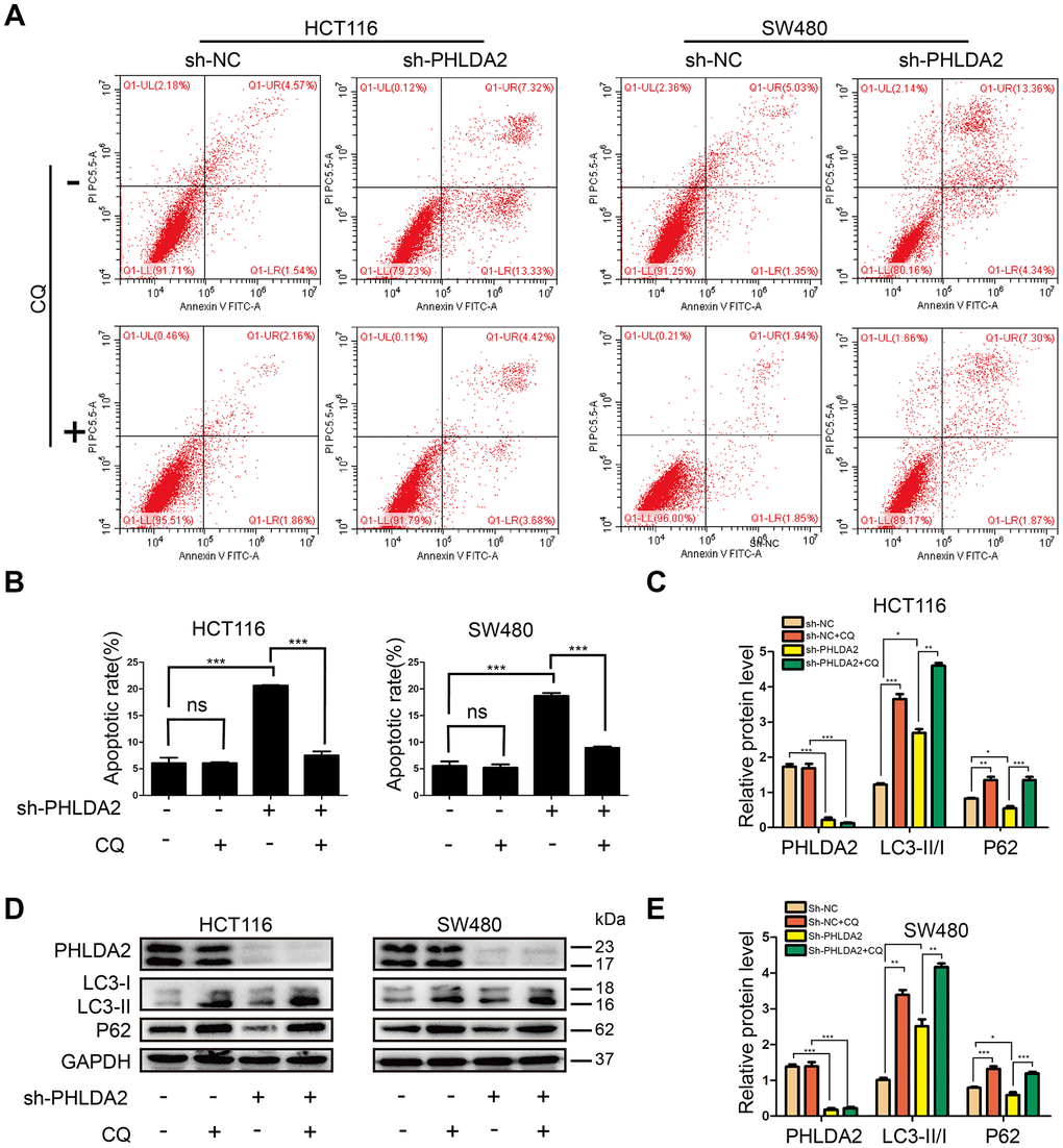 Inhibition of PHLDA2 increased autophagy (Figure 5A, 5B) and induced apoptosis (Figure 4B, 4C) of CRC cells. To determine whether PHLDA2-induced inhibition of apoptosis was related to autophagy, we used flow cytometry to assess cellular apoptosis with or without PHLDA2 inhibition, and with or without autophagy suppression by chloroquine (CQ). Results showed that inhibition of PHLDA2 increased apoptosis of HCT116 and SW480 cells. No obvious cytotoxicity was found in control cells treated with CQ alone (Figure 6A, 6B). CQ blocked autophagic flux (Figure 6C–6E) and partially rescued apoptosis in cells with low PHLDA2 levels (Figure 6A, 6B). These data demonstrate that PHLDA2-induced apoptosis in CRC cell lines is associated with an increased autophagic flux.