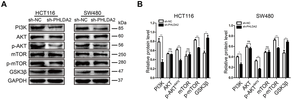 In conclusion, we demonstrated that PHLDA2 is a CRC tumor promoter. Low level of PHLDA2 inhibited the proliferation, invasion, and migration, as well as enhanced apoptosis of CRC cells in vitro. Similarly, silencing PHLDA2 reduced tumor growth in vivo. In addition, inhibition of PHLDA2 inhibited EMT and induced autophagy partly via the PI3K/AKT/mTOR and PI3K/AKT/GSK3β signaling pathways, respectively. Furthermore, low levels of PHLDA2 induced autophagy, which contributed to apoptosis in CRC cells. Low expression of PHLDA2 also inhibited EMT, contributing to suppression of invasion and migration in CRC cells. We anticipate that this study will provide a basis for diagnosis and treatment of CRC. However, this study has limitations, including a lack of data for PHLDA2 expression in normal colorectal cells, other protein inhibitors of the PI3K/AKT pathway were not assessed, and the limited number of CRC samples that were evaluated. These limitations will be addressed in the future.