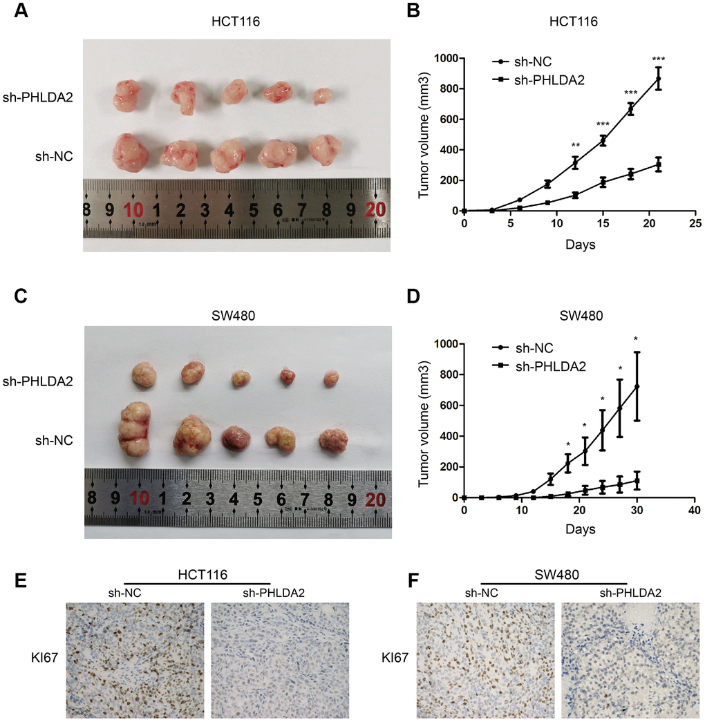 In the above in vitro experiments, we demonstrated that PHLDA2 promoted CRC cell growth, inhibited apoptosis, promoted EMT, and inhibited autophagy partly through the PI3K/AKT signaling pathway. We next tested the role of PHLDA2 in vivo. Stably-transfected HCT116 and SW480 cells were injected subcutaneously into the left flank of nude mice. We found that inhibition of PHLDA2 reduced the proliferation of HCT116 and SW480 cells in this mouse tumor model (Figure 8A–8D) and inhibited the expression of KI67 protein (Figure 8E, 8F). These results are consistent with the finding that inhibition of PHLDA2 inhibits cell proliferation in vitro (Figure 2E–2H), suggesting that PHLDA2 promotes CRC progression in vivo and vitro.