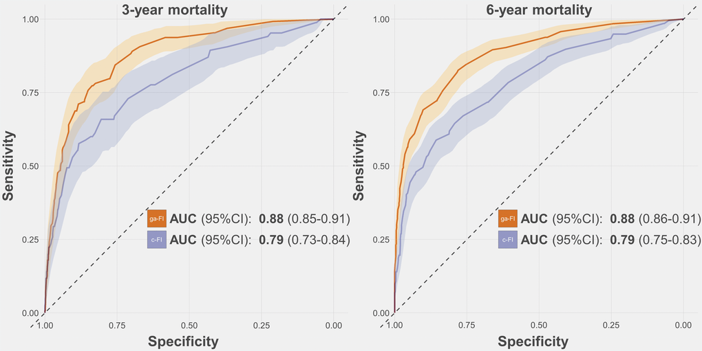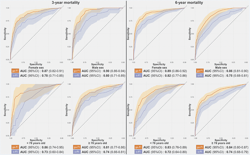 The ga-FI exhibited AUCs consistently higher than 0.80 across the whole test sample and its age and sex subsamples, both for 3-year and 6-year mortality prediction. Namely, the AUC for 3-year and 6-year mortality was 0.88 (95% confidence interval [CI] 0.85-0.91) and 0.88 (95% CI 0.86-0.91), respectively (Figure 2 and Supplementary Table 2). When applied to the subsamples, the ga-FI AUCs ranged from 0.81 (3-year mortality, older individuals) to 0.90 (3-year mortality, male sex). In a multivariate logistic regression adjusted by age, sex, cognitive status, and walking speed < 0.8 m/s, each increase by 0.1 in the ga-FI resulted in a 3-year mortality odds ratio of 2.17 (95% CI 1.54-3.04) and in a 6-year mortality odds ratio of 3.88 (95% CI 2.63-5.74). Comparing the ga-FI with a FI we had previously built on the basis of our clinical expertise (c-FI), which included 45 deficits [17], we found that only about half (N = 24) of the deficits were shared by the two indices (Supplementary Table 3). As depicted in Figures 2 and 3, in the test sample, the ga-FI showed higher areas under the curve (AUCs) in the prediction of mortality in the whole population and in all subsamples, when compared with the c-FI. Differences between the AUCs exhibited by the ga-FI and c-FI did not reach statistical significance only in the younger and older subsamples for 3-year mortality (Supplementary Table 2).