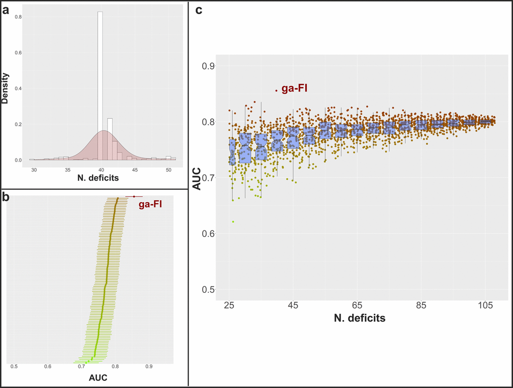 As shown in Figure 4A, almost all the best FIs from each iteration over ten runs of the genetic algorithm included 40 deficits. In order to investigate the meaning of such a finding, we randomly generated 100 FIs that included 40 deficits, and compared their AUCs with the ga-FI. As shown in Figure 4B, none of the randomly generated FIs reached the same predictive accuracy of the ga-FI. Finally, upon generating about 2000 random FIs that included between 25 and 108 deficits, none of them presented with an AUC as high as that of the ga-FI (Figure 4C).
