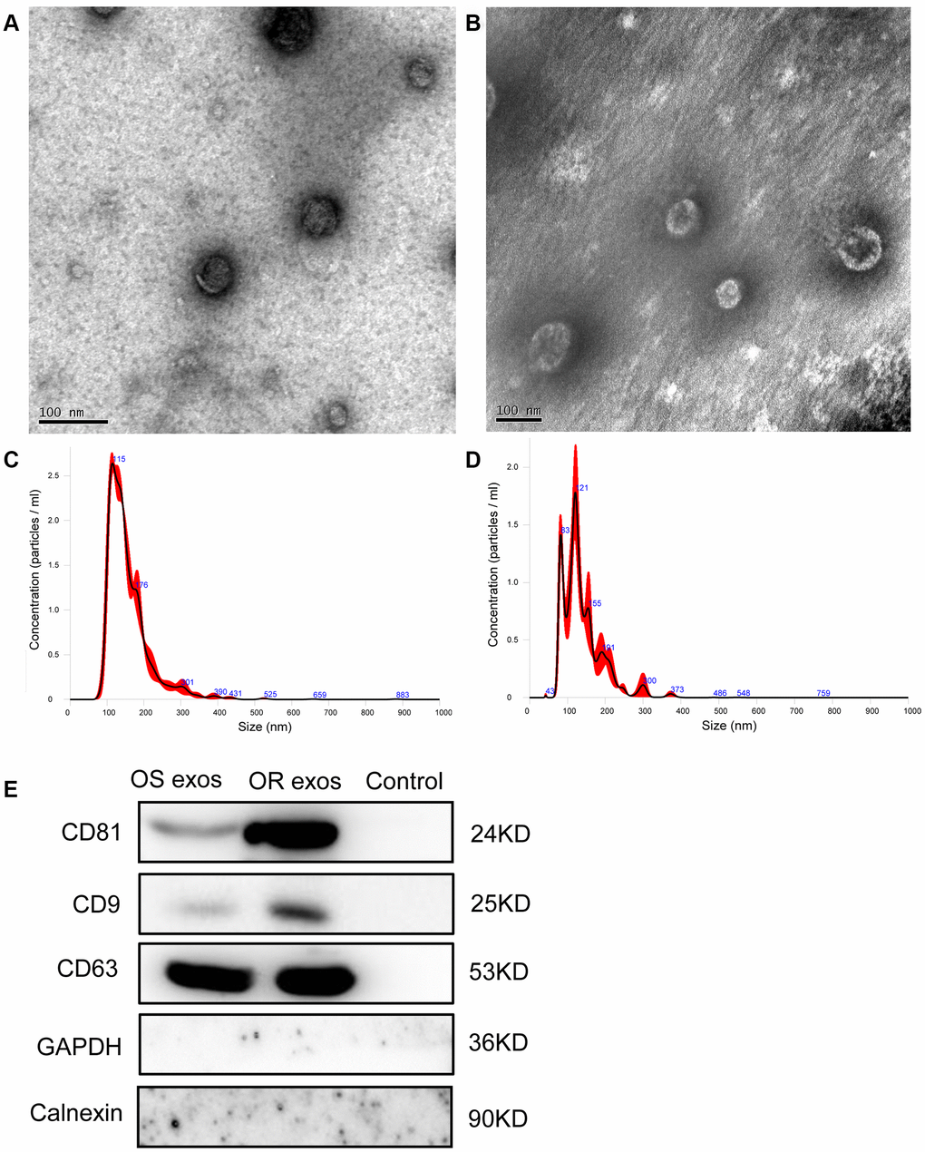 The exosomes were lysed in radio-immunoprecipitation assay (RIPA) buffer (Beytime, Shanghai, China) supplemented with 1 mM PMSF. The lysate was centrifuged at 4°C, 12000 ×g for 10 min. Protein concentrations were evaluated by BCA kit. After being separated by SDS-PAGE, the proteins were transferred to polyvinylidene difluoride membranes (PVDF; Bio-Rad, USA). The primary antibodies, including anti-CD9 (1:1000; ab92726, Abcam), anti-CD63 (1:1000; A5271, ABclonal), anti-CD81 (1:1000; ab109201, Abcam), anti-calnexin (1:1000; 10427-2-AP, Proteintech) and anti-GAPDH (1:5000; 10494-1-AP, Proteintech) were added and incubated at 4°C overnight. After washing, the blots were incubated with the second antibodies (goat anti-rabbit IgG (H+L) -horseradish peroxidase (HRP), 1:1000 at 37°C for 2h. At last, the proteins were visualized by Millipore ECL system.