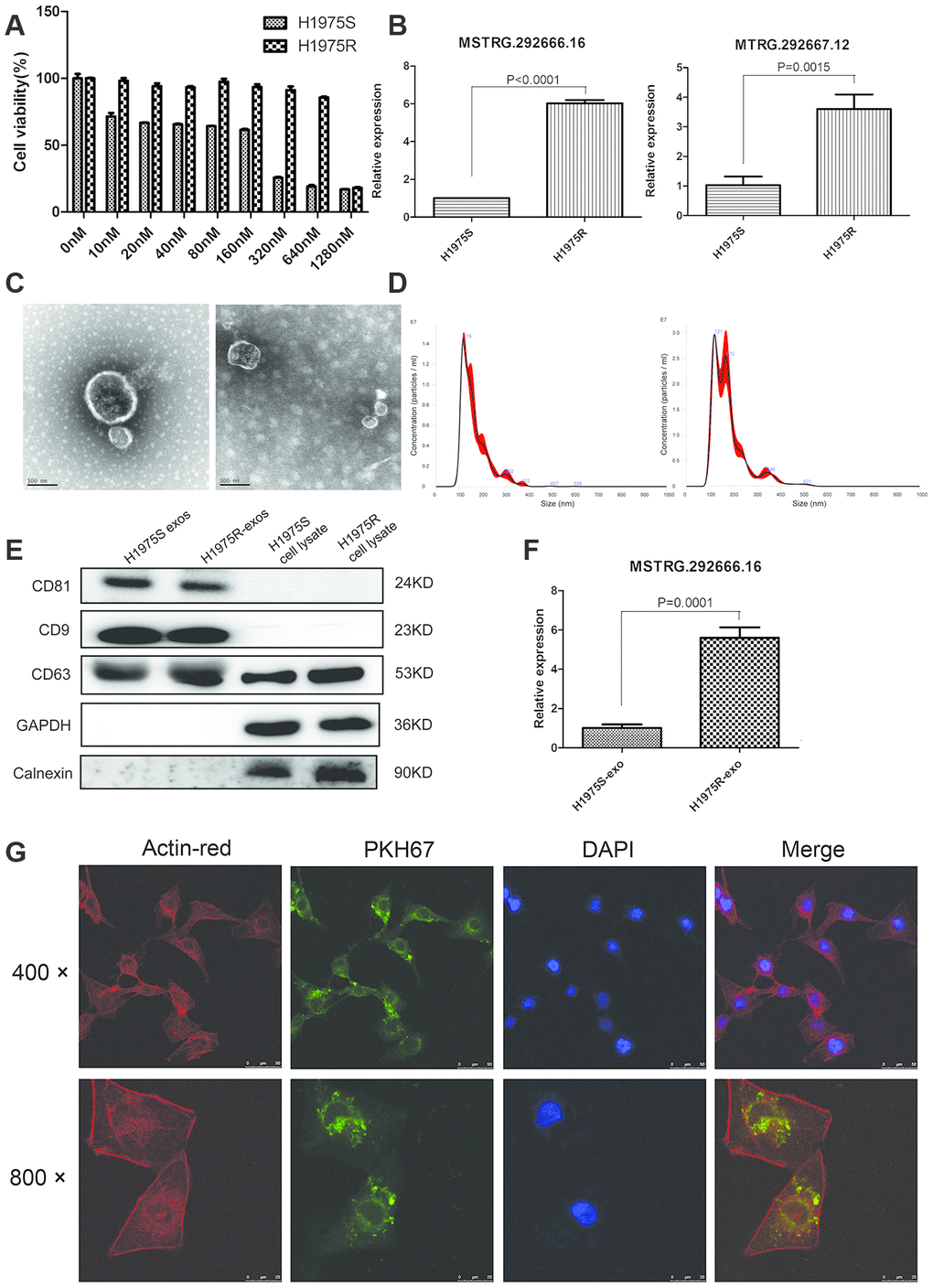 To investigate whether exosomes could be uptaken by recipient cells, H1975S cells were cocultured with PKH67- labeled H1975R exosomes. Examination using confocal microscopy showed that PKH67 green fluorescence signals were visible around the nuclei and in the cytoplasm of H1975S cells. This result confirmed the uptake of PKH67-labeled H1975R exosomes by H1975S cells (Figure 3G).