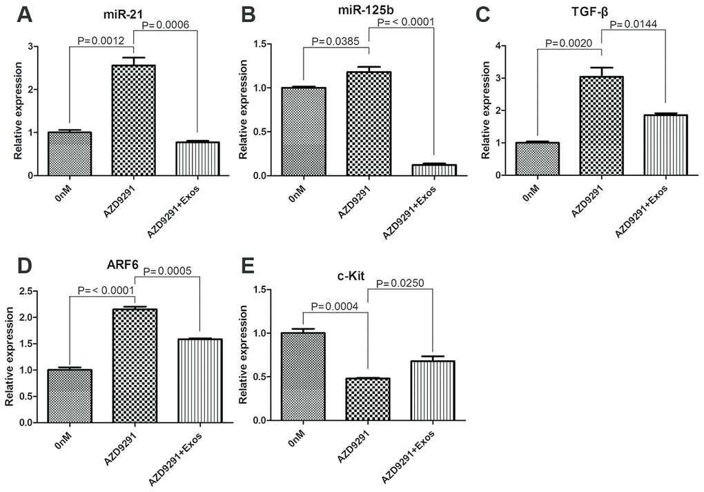 The effects of osimertinib-resistant exosomes on expression of several genes, including miR-21, miR-125b, TGFβ, ARF6 and c-Kit were detected. The relative expression levels of miR-21, miR-125b, TGFβ and ARF6 were significantly upregulated after treated with 100 nM osimertinib for 24 h. However, co-incubated with 10 μg/ml osimertinib-resistant exosomes could reverse the effects of osimertinib alone on gene expression changes (P < 0.05, Figure 4A–4D). The relative expression of c-Kit was significantly downregulated in osimertinib treated H1975 cells, while co-incubated with osimertinib-resistant exosomes could significantly upregulated the expression of c-Kit (P < 0.05, Figure 4E). These results suggested that osimertinib-resistant exosomes could regulate gene expressions induced by osimertinib.