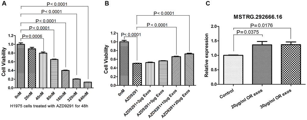 We further investigated whether lncRNA MSTRG292666.16 can be packaged into exosomes, and whether exosomal lncRNA MSTRG292666.16 could mediate osimertinib resistance. qRT-PCR results suggested the expression of lncRNA MSTRG292666.16 was detectable and markedly increased in the H1975 cells incubated with the extracted exosomes from osimertinib -resistant plasma. Treatment of the H1975 cells with exosomes containing lncRNA MSTRG292666.16 induced an enhanced osimertinib resistance. To conclude, lncRNA MSTRG292666.16 could be transferred by exosomes and participated in the development of osimertinib resistance.