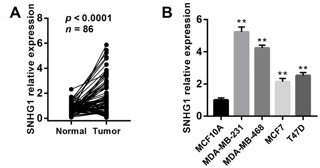 We also measured SNHG1 expression using Q-RT-PCR in MCF10 mammary epithelial cell lines and four breast cancer cell lines (MDA-MB-231, MDA-MB-468, MCF7, and T47D). As expected, SNHG1 expression was higher in the breast cancer cell lines than in the MCF10A cells (Figure 1B).