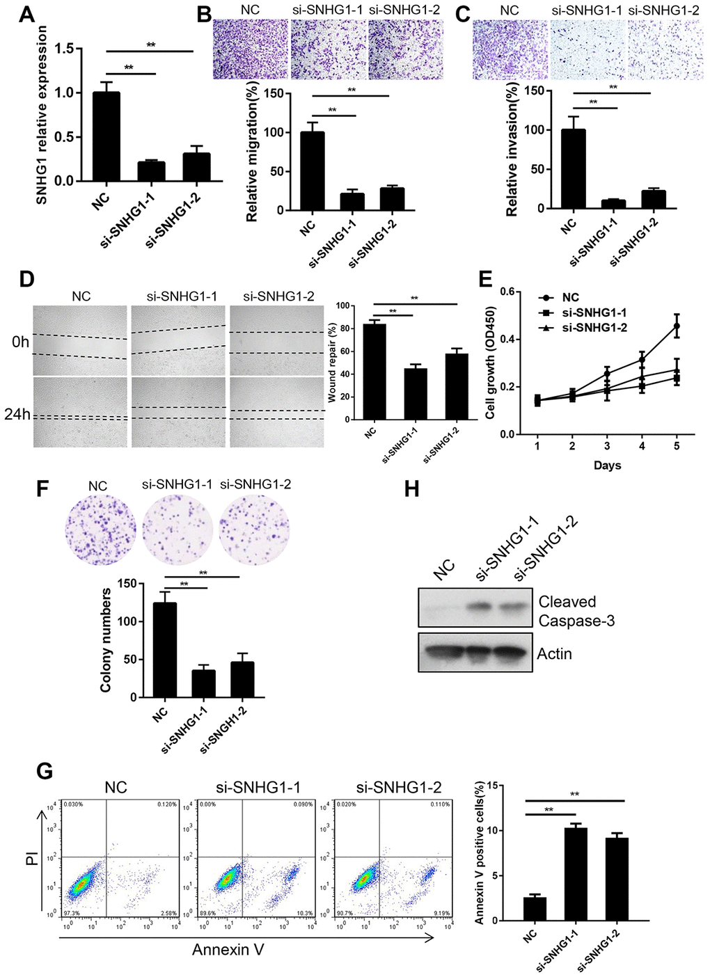 Next, we explored the function of SNHG1 in breast cancer cell proliferation. A CCK-8 cell growth assay showed that silencing of SNHG1 significantly inhibited the proliferation of MDA-MB-231 cells (Figure 2E). A colony formation assay showed similar results (Figure 2F). We then examined cell apoptosis using cell cytometry and SNHG1 knockdown enhanced apoptosis of MDA-MB-231 cells (Figure 2G). Cleaved caspase-3, a marker of cell apoptosis, was increased in a Western blot assay following SNHG1 silencing (Figure 2H).