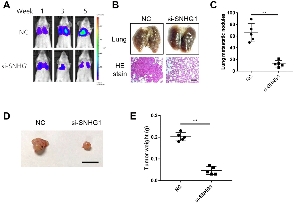 Next, we examined the effect of SNHG1 on breast cancer cell metastasis in an in vivo mouse model. We injected SNHG1 knockdown or negative control (NC) MDA-MB-231 cells into severe combined immunodeficiency (SCID) mice via the tail vein. In vivo imaging was used to monitor tumor metastasis. The SNHG1 knockdown group showed significantly reduced tumor growth in the lungs compared with the NC control group (Figure 3A). Similarly, the number of tumor nodules in mice of the SNHG1 knockdown group was decreased compared with the NC group (Figure 3B, 3C).