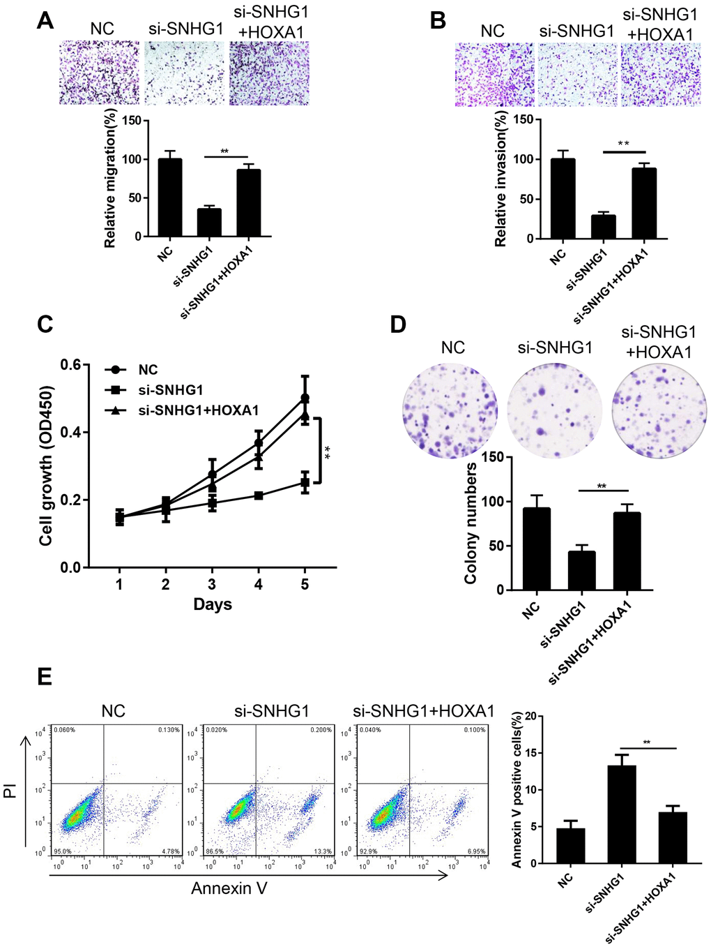 To confirm that HOXA1 is involved in the SNHG1 pathway in breast cancer progression, we tested whether enforced HOXA1 expression would eliminate the effect of SNHG1 silencing in MDA-MB-231 cells. We overexpressed HOXA1 in SNHG1 knockdown (si-SNHG1+HOXA1) MDA-MB-231 cells. The expression of SNHG1 and HOXA1 in NC, si-SNHG1, and si-SNHG1+HOXA1 MDA-MB-231 cells was confirmed using Q-RT-PCR (Supplementary Figure 1A, 1B). Transwell assays showed that HOXA1 overexpression restored cell migration and invasion capacities (Figure 5A, 5B). In addition, the cell proliferation ability of MDA-MB-231 cells was also reversed by HOXA1 overexpression (Figure 5C, 5D). Cell cytometry assays indicated that the cell apoptosis rate was reduced after HOXA1 overexpression in SNHG1 knockdown MDA-MB-231 cells (Figure 5E). Moreover, we also overexpressed HOXA1 in MDA-MB-231 cells transfected with miR-193a-5p mimics. The transwell assay results suggested that transfection of miR-193a-5p mimics inhibits the migration and invasion of MDA-MB-231 cells while HOXA1 overexpression reverses this effect (Supplementary Figure 2A, 2B). These data above indicate that HOXA1 is the main target gene of SNHG1 and SNHG1/miR-193a-5p/HOXA1 axis plays a critical role in breast cancer progression.