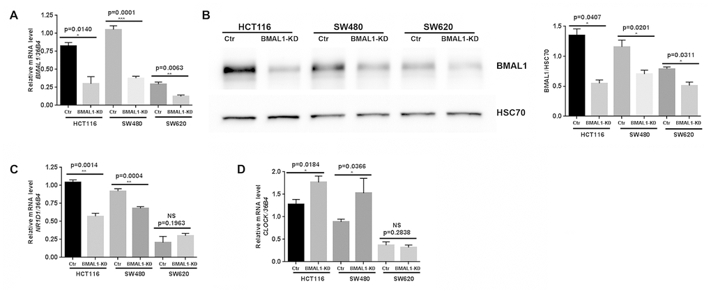 BMAL1-KD thus modified circadian gene expression profile in two primary CRC cell lines (HCT116 and SW480) but not in the metastatic CRC cell line SW620.