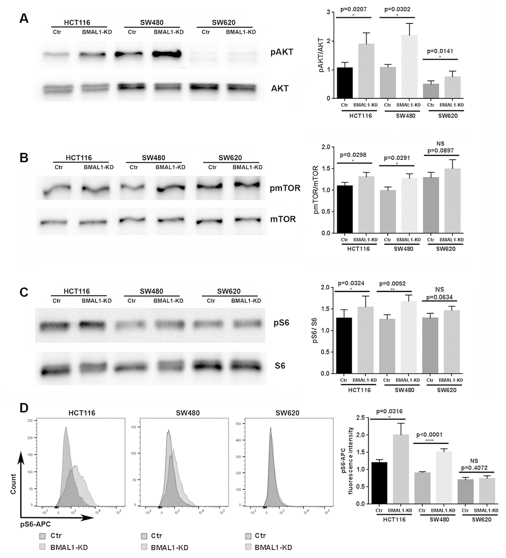 To further evaluate mTOR activity, we measured the phosphorylation of 40S Ribosomal protein S6, a major mTOR effector. Western blot analysis revealed a significant increase of S6 phosphorylation (pS6/S6 total) in HCT116 BMAL1-KD cells (p=0.0324) and in SW480 BMAL1-KD cells (p=0.0052) compared to controls. However, only a trend to increased phosphorylation was found in SW620 BMAL1-KD (p=0.0634; Figure 2C). These results were further confirmed by flow cytometry analysis, which revealed that the mean fluorescence intensity of pS6-APC staining increased significantly in HCT116 BMAL1-KD cells (p=0.0316) and in SW480 BMAL1-KD cells (p<0.0001), but not in SW620 BMAL1-KD cells (p=0.4027) compared to their own controls (Figure 2D).