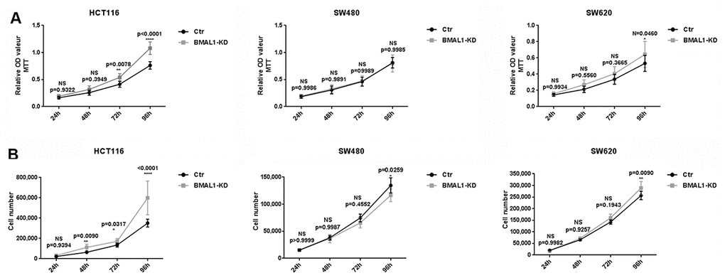 The BMAL1-KD or control CRC cell lines were seeded in 96-well plates at an initial density of 2x103 cells per well. Cell proliferation was measured daily during 4 days by Vybrant MTT Cell Proliferation Assay Kit (V13154, Molecular Probes, Invitrogen). Every time point was repeated 3-4 times in independent experiments. Two-way ANOVA was used for statistical analysis of 8 independent experiments.