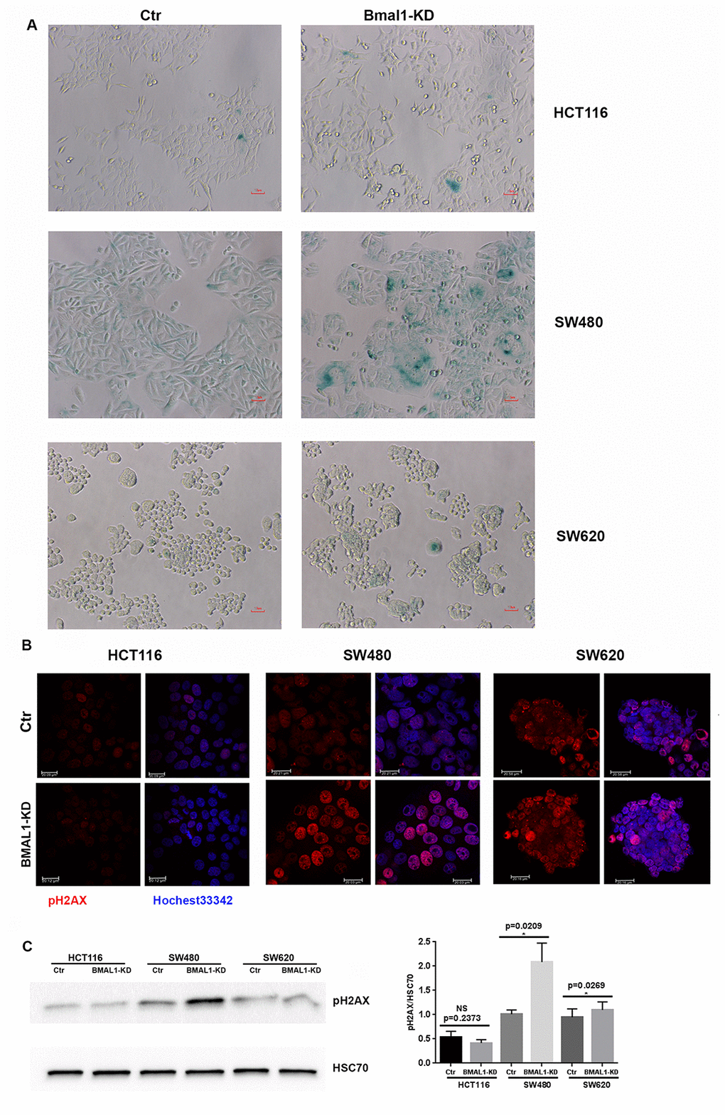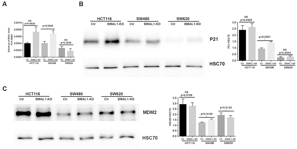 In summary, after BMAL1-KD cellular senescence was only induced in one primary CRC line (SW480) in association with nuclear translocation of P53 and increased expression of P21 and MDM2.