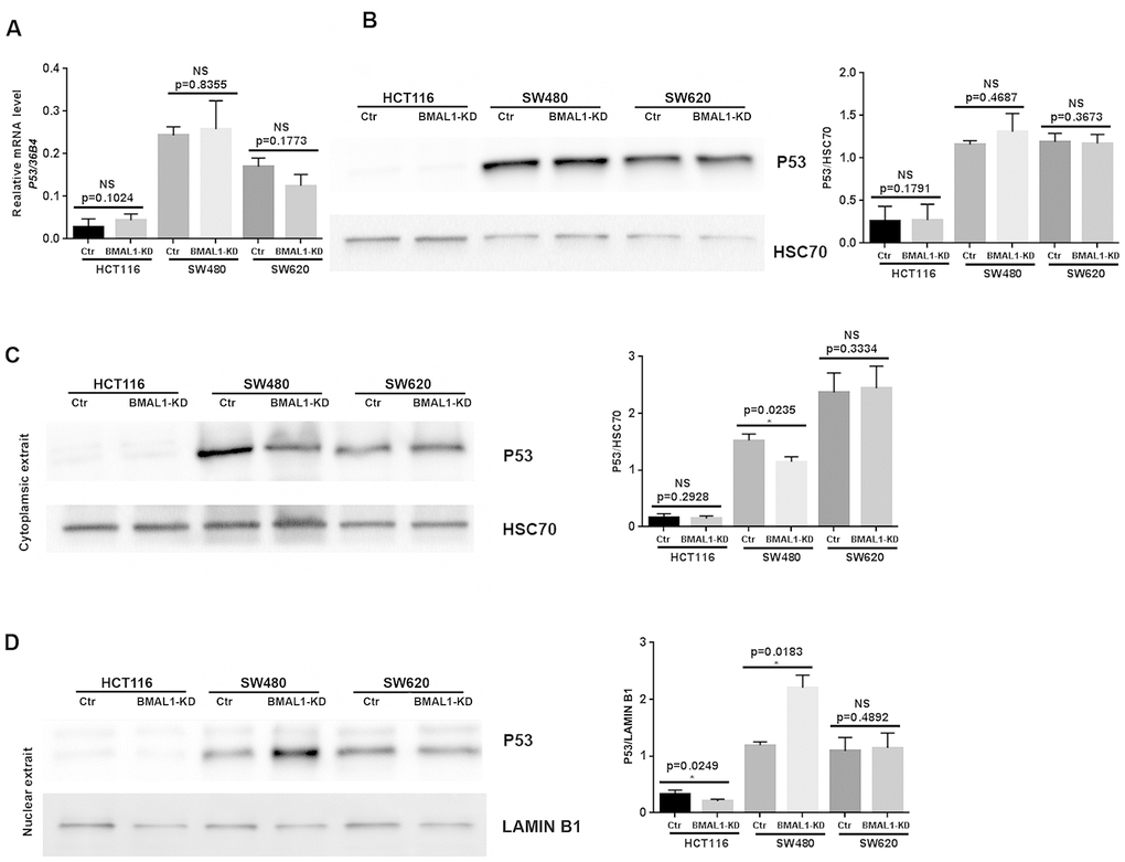 Cell senescence is also mediated by, and can induce, P53/P21 activation [31]. Although P53 mRNA (Figure 5A, qRT-PCR) and protein (Figure 5B, western blot) levels did not change in the three BMAL1-KD CRC cell lines, there was a change of P53 localization in SW480 BMAL1-KD cells. Compared to control, cytoplasmic P53 decreased (p=0.0235; Figure 5C) and P53 nuclear expression increased (p=0.0183; Figure 5D) in SW480 BMAL1-KD cells, suggesting P53 activation. In contrast, P53 cytoplasmic expression did not change in HCT116 BMAL1-KD and SW620 BMAL1-KD cells. Moreover, P53 nuclear localization in HCT116 BMAL1-KD cell line even decreased compared to its own control (p=0.0249; Figure 5D).