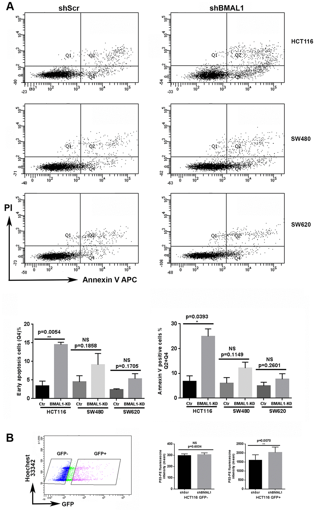Without puromycin selection, only GFP positive (GFP+) cells were considered as shRNA transduced. In the GFP+ population, the cells undergoing early apoptosis, i.e., Annexin V-positive and PI-negative cells, as well as the total apoptosis cells (Annexin V-positive cells) are all increased in shBMAL1 vs. shScr transduced HCT116 cells (p=0.0054 and p= 0.0393). However, shBMAL1 transduced SW480 (p=0.1858and p=0.1149) or SW620 (p=0.1705 and p=0.2601) cells only presented a trend to increase apoptosis (Figure 7A).