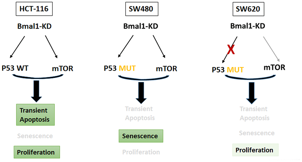 A possible explanation for this variance in cellular senescence between SW480 and HCT116 cells is their different P53 status. The HCT116 cell line expresses wild type (WT) P53, whereas the SW480 cell line carries a mutant P53 (R273H and P309S; mP53) which is only partially functional, such as inducing P21 expression [42]. Knockdown of this mP53 decreases colorectal cancer malignancy, indicating its important role in CRC development [43]. Blagosklonny et al. hypothesized that maximal P53 activity blocks mTOR, causing cellular quiescence or death, whereas partial P53 activity sustains mTOR activity and causes senescence [23–26]. In keeping with this hypothesis, we propose that the different P53 status (WT vs mutant) of HCT116 and SW480 cells underlies the different cell fates induced by mTOR activity after BMAL1-KD.