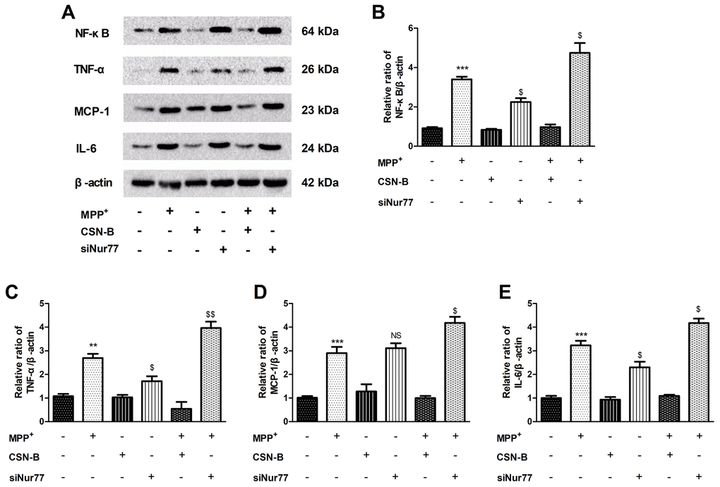 The pathogenesis of PD is accompanied by the strong expression or activation of various inflammatory factors Figure 2A, including NF-κB, TNF-α, IL-6 and MCP-1 Figure 2B–2E. Changes of inflammatory factors can affect neuronal activity and stress responses in surrounding tissues [19]. We used the classical Nur77 agonist CSN-B to induce strong expression of Nur77 prior to inflammatory factor production. We similarly observed the expression of inflammatory factors after treatment with siNur77. CSN-B and siNur77 treatment alone cann’t change expression of NF-κB, TNF-α, IL-6 and MCP-1. MPP+ incubation pronouncedly increased level of NF-κB, TNF-α, IL-6 and MCP-1 compared with controls, while this elevation was significantly abolished following CSN-B treatment. (Supplementary Figure 1). Silencing of Nur77 with siRNA significantly enhanced the expression of NF-κB, TNF-α, IL-6 and MCP-1 in MPP+-treated PC12 cells.
