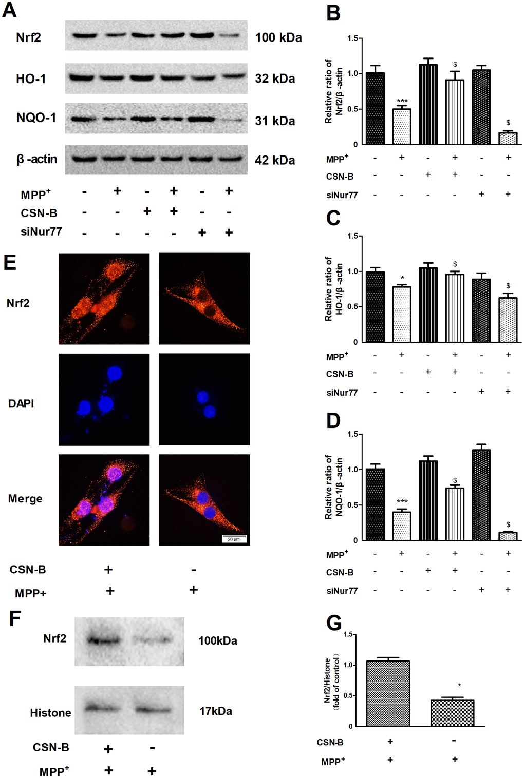 Our findings demonstrated a significant reduction in Nrf2 expression under MPP+ stress conditions when compared to the control level. However, CSN-B treatment significantly reversed the reduction of Nrf2 caused by MPP+, B. Furthermore, siNur77 transfection significantly reduced the expression of Nrf2 under MPP+ stress (Figure 3A, 3B). In response to CSN-B, translocation of Nrf2 from the nucleus to the cytoplasm was clearly observed (Figure 3E, 3F).