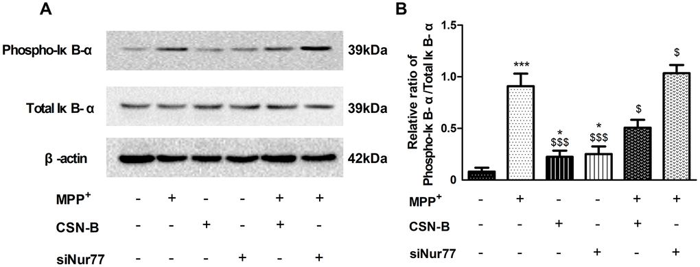 In recent studies of neurodegenerative diseases, especially AD and PD [21], the regulation of NF-κB is considered a key pathological element. Our study found that phosphorylation IκB-α was significantly increased in MPP+-treated PC12 cells, while CSN-B mitigated this increase. Moreover, we also observed significantly elevated levels of phosphorylated IκB-α in siNur77-treated PC12 cells relative to the control group in Figure 5A, 5B.