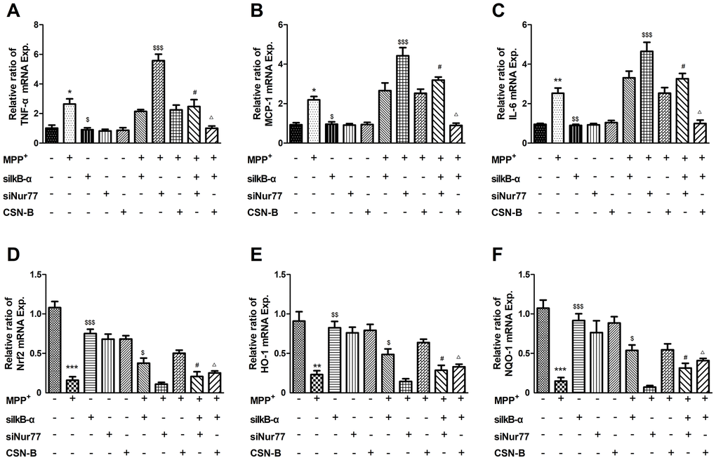 To further demonstrate that Nur77 attenuates inflammatory responses and oxidative stress by phospho-IκB-α, primary neurons were treated with MPP+, the Nur77 agonist cytosporone B, and/or small interfering RNAs (siRNAs) against Nur77 and siIκB-α. We found that MPP+ significant increased the expression of mRNAs encoding TNF-α, IL-6 and MCP-1 and decreased Nrf2, HO-1, NQO-1, while siIκB-α can reverse the changes. The role of CSN-B is the same as siIκB-α, while siNur77 can significantly increase level of TNF-α, IL-6 and MCP-1 and decrease level of Nrf2, HO-1, NQO-1. These results prove that Nur77 can inhibit inflammatory responses and oxidative stress in MPP+ treated primary neurons (Figure 6).