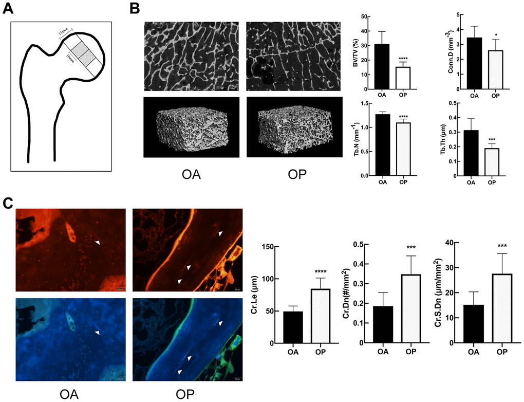 OP group showed deteriorated bone microstructure and more microdamage than OA