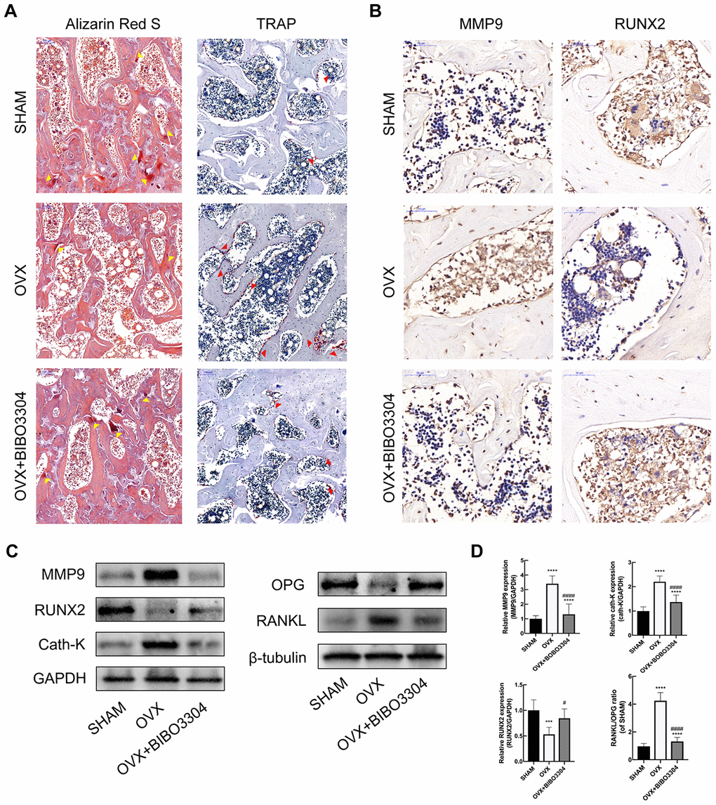 The bone marrow from rat femurs was extracted and analyzed by western blotting. The results showed that the expression level of RUNX2 and OPG enhanced, and MMP9 and Cath-K decreased apparently in OVX+BIBO3304 group than those in the OVX group. Besides, the RANKL/OPG ratio in OVX+BIBO3304 group was markedly decreased in comparison with that in OVX rats (Figure 4C, 4D). The results indicated that treatment with BIBO3304 inhibited the bone resorption, and promoted bone formation meanwhile in OVX rats.