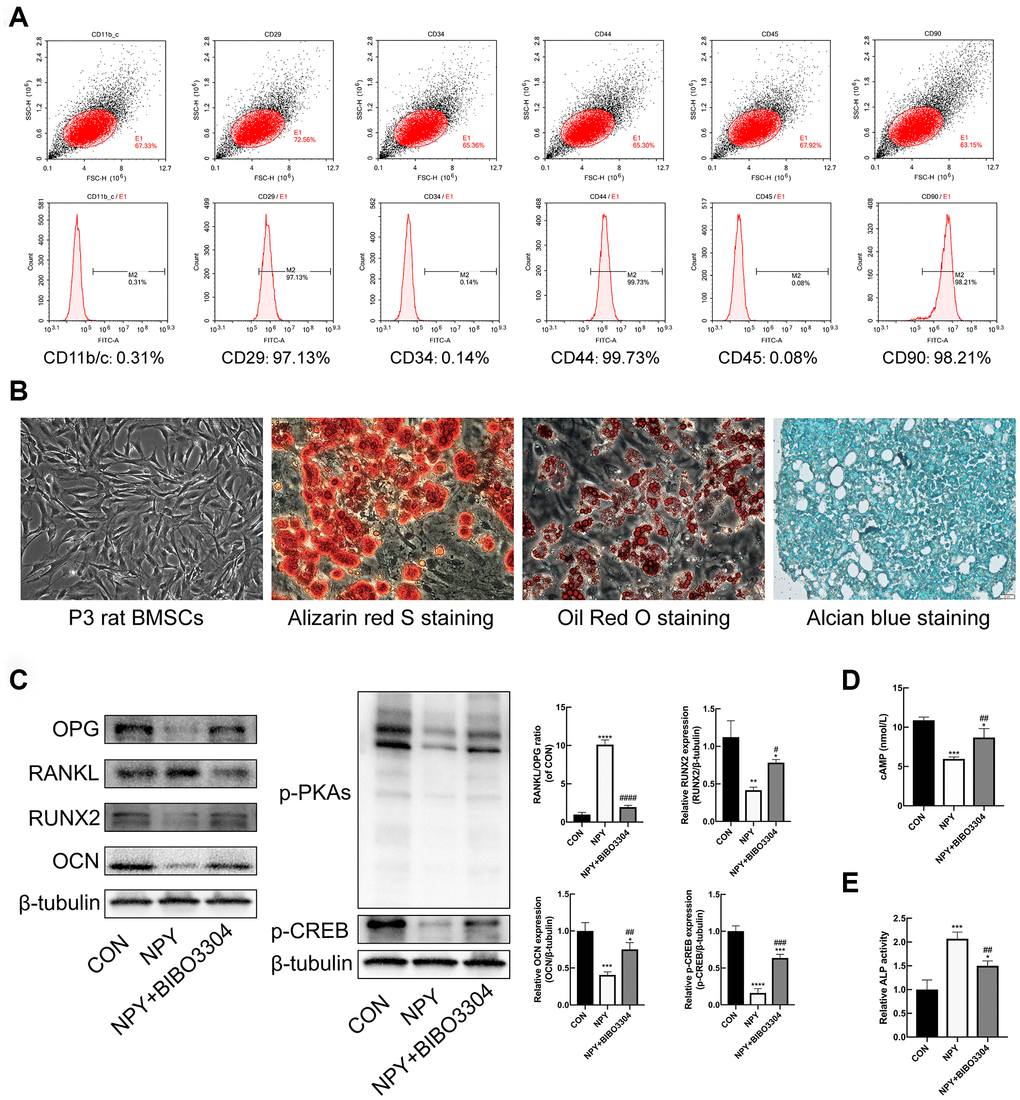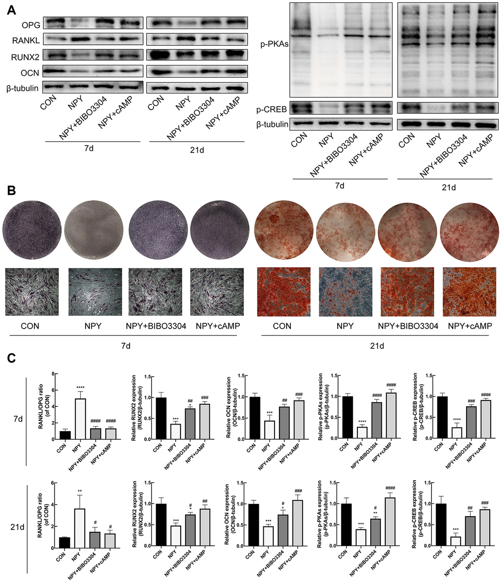 BMSCs were seeded in 6-well plates (Corning, NY, USA) at 1 × 105 cells/well. we divided the cells into 4 groups to investigate the role of NPY in the cAMP/PKA signaling pathway and the Y1R relationship. The CON group was treated a volume of phosphate-buffered saline (PBS; Gibco, Grand Island, NY, USA) equal to that used for treatments; The NPY group was treated with 10-10 M NPY (Abcam, Cambridge, USA); The NPY+BIBO3304 group was supplemented with 10-10 M NPY and 10-6 M Y1R antagonist (BIBO3304, Tocris Bioscience, UK). The NPY+ cAMP group was treated with a mixture of NPY and 10-4 M 8-bromoadenosine-3',5'-cyclic monophosphate (8-Bromo-cAMP, Selleck Chemicals, USA). 8-Bromo-cAMP is a small molecule cAMP analogue, which is an activator of PKA. For osteogenic induction, the medium was changed to the osteogenic medium containing with 10-7 M dexamethasone (Sigma-Aldrich, USA), 10-2 M sodium β-glycerophosphate (Sigma-Aldrich, USA) and 50 μg/mL L-ascorbic acids (Sigma-Aldrich, USA).