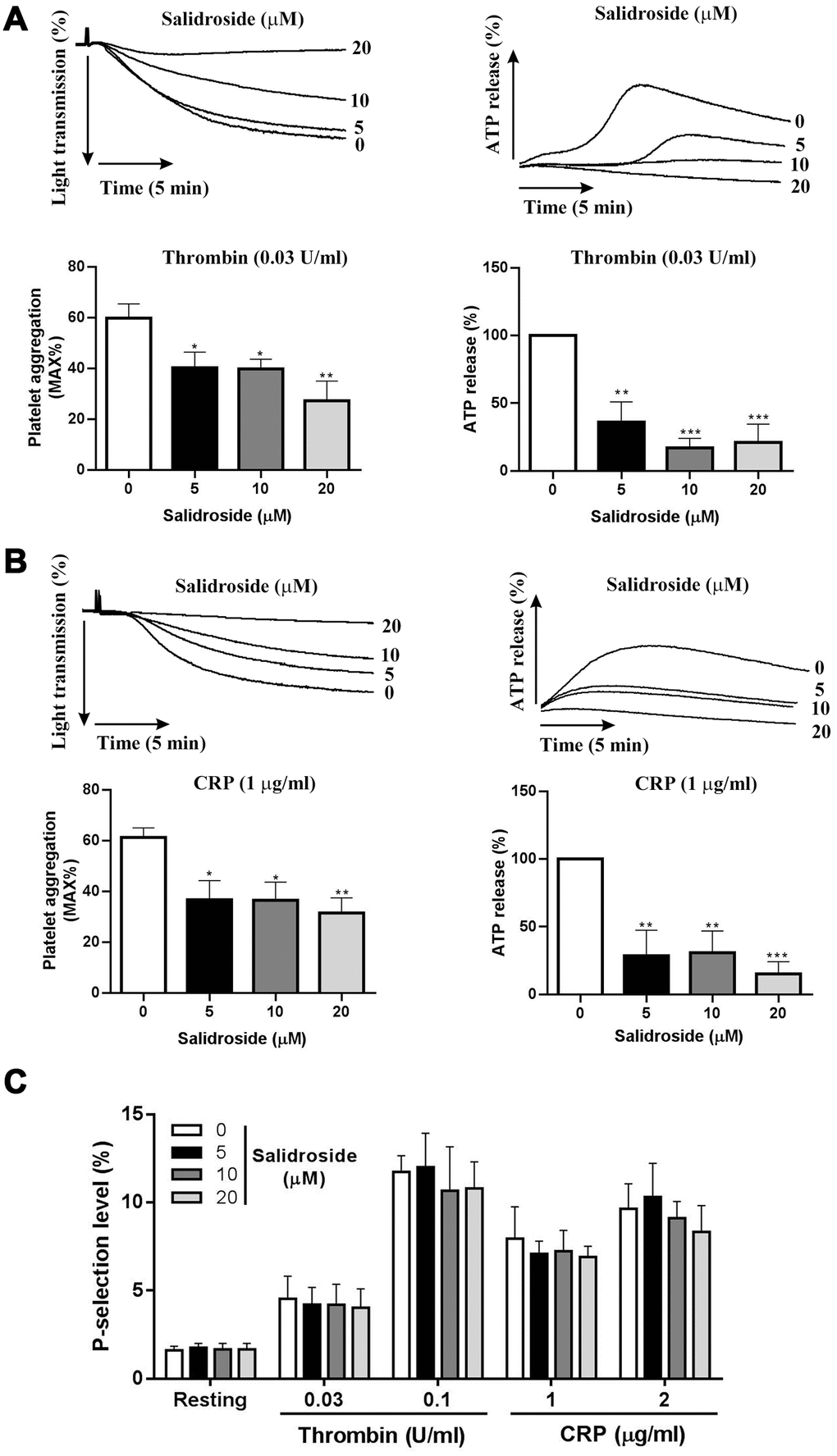 Through incubation with human washed platelets with salidroside (0, 5, 10 and 20 μM), we investigated whether salidroside affects platelet aggregation in response to thrombin (0.03 U/ml) or CRP (1 μg/ml) stimulation. As seen in Figure 1, salidroside treatment significantly reduced thrombin (Figure 1A) or CRP (Figure 1B)-induced platelet aggregation compared with vehicle treatment (0 μM salidroside) with more decrease of platelet aggregation after treatment with the highest concentration of salidroside (20 μM). To further investigate whether salidroside influences ATP release which simultaneously occurs along with platelet aggregation, we also detected ATP release and found significantly reduced ATP release from thrombin or CRP-stimulated platelets after salidroside treatment compared with vehicle treatment (Figure 1A, 1B), with more reduction being observed in platelets treated with the highest dose of salidroside (20 μM). As alpha-granule content is also released after platelet aggregation, we further measured platelet alpha-granule content release (surface P-selectin expression) after salidroside treatment. Surprisingly, salidroside did not affect thrombin or CRP-induced platelet alpha-granule content release even at a highest concentration (20 μM) as shown by no changes of platelet P-selectin surface expression after salidroside treatment compared with vehicle (Figure 1C). This difference might be due to the different function of alpha granules and dense granules [20, 21], and ATP or ADP secretion from dense granules has been reported to promote platelet in response to low level of agonists [22].