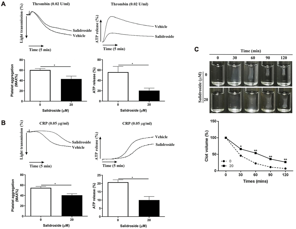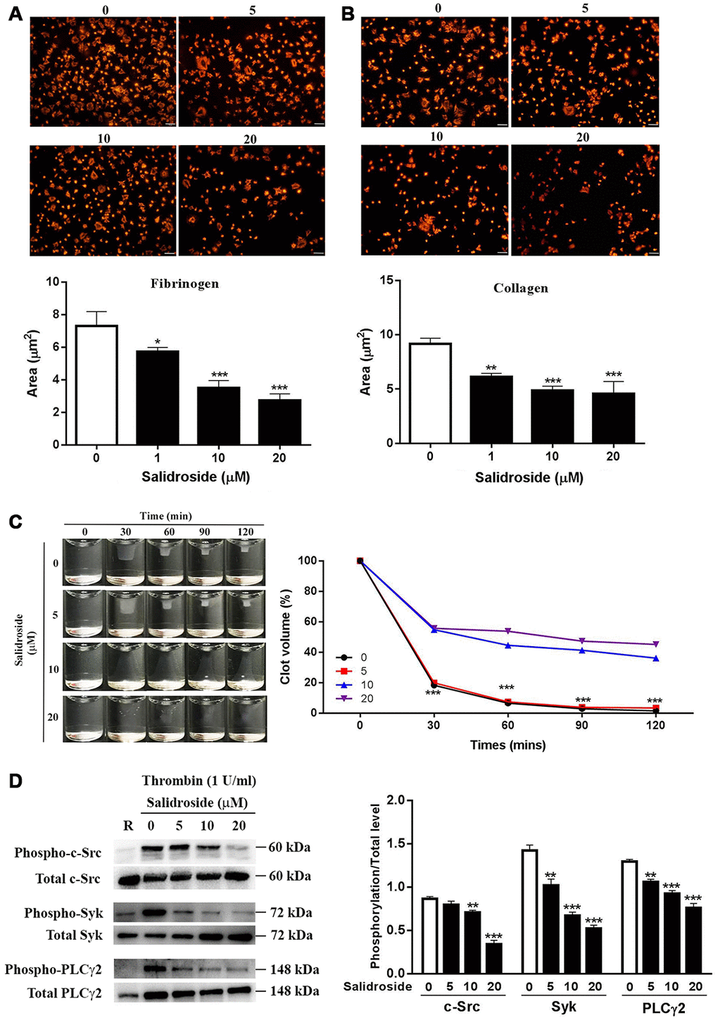 In the present study, through treating platelets with salidroside, we aim to investigate the effect of salidroside on platelet aggregation, activation, spreading and clot retraction. Moreover, salidroside’s effect on in vivo hemostasis and thrombosis was also evaluated.