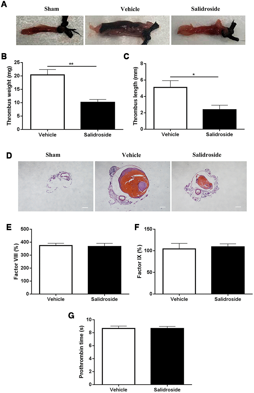 Beyond hemostasis and arterial thrombosis, platelets also play a role in the venous thrombus formation [27]. Since salidroside inhibits in vivo platelet function, we next investigated whether it influences venous thrombus formation using deep vein thrombosis (DVT) model (stenosis of the inferior vena cava). As seen in Figure 6, venous thrombus formation was found in DVT mouse model (Vehicle) and not observed in sham group (Figure 6A). After administration of salidroside, the thrombus weight was significantly decreased (Figure 6B) and thrombus length was significantly shortened (Figure 6C) in DVT mouse model compared with vehicle treatment. In addition, H&E staining of the venous cross-section showed dramatic thrombus formation in DVT mouse model treated with vehicle as demonstrated by the presence of a red thrombus (Figure 6D), which was reduced after salidroside injection. To exclude the involvement of coagulation in deep vein thrombosis, we also measured the level of coagulation factor VIII (Figure 6E) and IX (Figure 6F) as well as the prothrombin time (Figure 6G) and found that there was no significant difference of these parameters in mice receiving the injection of vehicle and salidroside. Taken together, these data show that salidroside decreased deep vein thrombus formation without affecting coagulation.