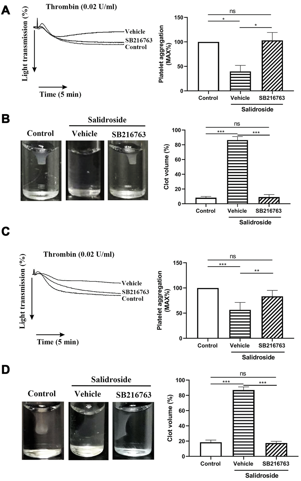 Isolated human or mouse platelets were treated with different doses of salidroside (0, 5, 10 and 20 μM for human platelets; 0 and 20 μM for mouse platelets) at 37°C for 1 h. For some experiments, isolated human or mouse platelet were incubated with SB216763 (10 μM) or vehicle for 2 h at 37 °C and then treated with salidroside followed by analysis of relevant analysis.