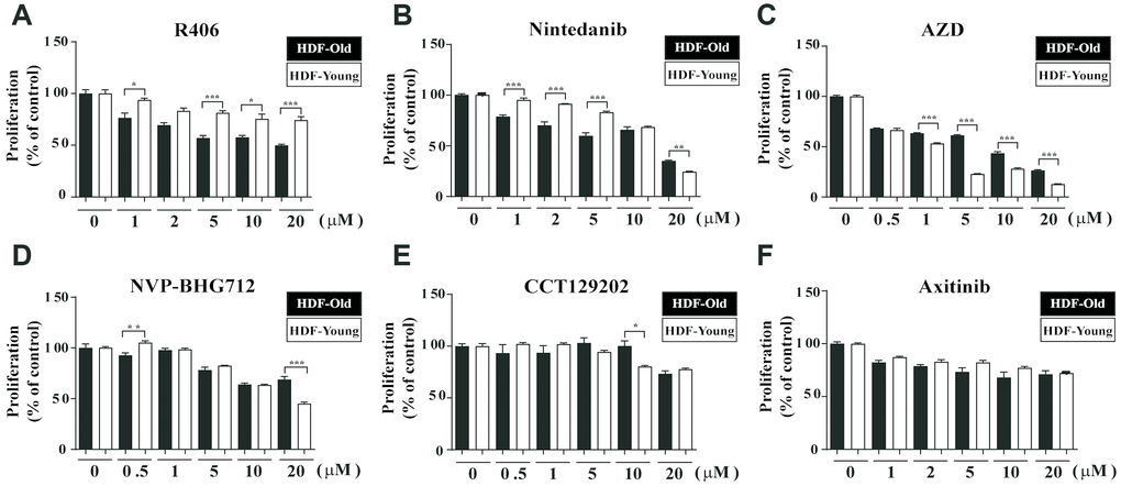 Cell viability was determined using water-soluble tetrazolium salt-based D-plus cell viability and cytotoxicity assay reagent (CCK-1 reagent, Dongin LS, Korea). Cells were seeded in the 96-well plate and respectively treated with 0.5, 1, 5, 10 and 20 μM of NBP-BHG712, AZD and CCT129202, and 1, 2, 5, 10 and 20 μM of nintedanib, R406 and axitinib, and 0.1, 0.5, 1, 2 and 4 μM of bosutinib, and 1, 10, 25, 50, and 75 μM of selumetinib for 24 hours in the growth media. Cells were treated with 0.1, 0.5, 1, 5, and 10 μM of ABT263 respectively for one day or three days. Cells were then treated with 10 μl CCK-1 reagent and incubated for 4 hours at 37 °C in 5% CO2 incubator. After incubation, plates were read absorbance in 450 nm using the multi plate reader (Infinite M200PRO). In to check cell viability using the Hoechst 33342 staining, cells were seeded in the 24-well plate and respectively treated with 1, 2, 5, 10 and 20 μM of R406 for 24 hours in the growth media. Cells were then fix with 100% methanol for 10 min and washed with PBS. The Fixed cells were stained with 1 μg/ml Hoechst 33342 (#639, Immunochemistry Technologies, MN, USA) for 1 h and washed twice with PBS. Cell number was determined by measuring fluorescence intensity in Excitation/Emission: 355 nm/460 nm using the multi plate reader (Infinite M200PRO).