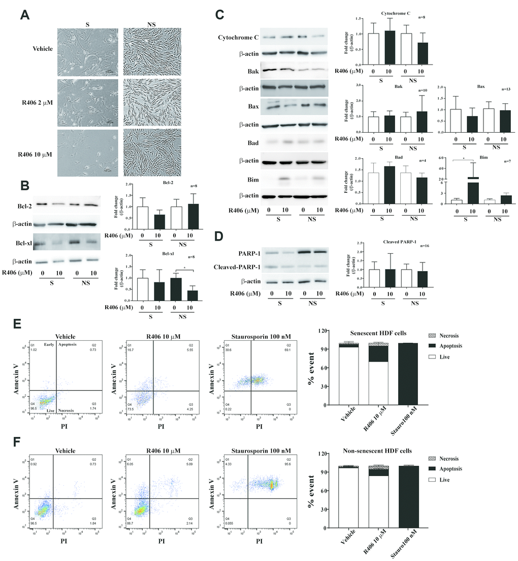 Senescent cells demonstrate elevated expression of anti-apoptotic and pro-survival factors [15, 17, 22]. Typical senolytic agents inhibit cell viability by modulating expression of these factors, particularly Bcl-2 family [26]. Therefore, we investigated whether the cytotoxic effect of R406 is caused by the induction of apoptosis. R406 induced cell shrinkage in senescent HDFs compared to non-senescent HDFs, and decreased cell number of senescent HDFs. The non-senescent HDFs showed only slightly delayed cell growth with R406 (Figure 2A). Unexpectedly, R406-dependent downregulation of Bcl-2 and Bcl-xl expression was not significant in senescent HDFs as compared to non-senescent HDFs (Figure 2B). Instead, the level of Bim as well as cleaved-caspase-9, -7, and -3 were induced by R406 in senescent HDFs, though the amount of cytochrome C, Bak, Bax, and Bad were also not significantly changed (Figures 2C and 3). The levels of cleaved-caspase-8, an indicator of extrinsic apoptotic signal induction, or cleaved-PARP-1, which is a late apoptotic marker, were not changed by R406 treatment in either senescent or non-senescent cells (Supplementary Figure 3A and Figure 2D, respectively). To confirm that R406 is associated with apoptosis in a senolytic effect, we performed an apoptosis assay by flow cytometry with annexin V and propidium iodide (PI) staining after treating either a vehicle (dimethyl sulfoxide; DMSO) or 10 μM R406 for one day in senescent and non-senescent HDFs. For the analysis, staurosporine was used as a positive control of the apoptotic effect. As a expect, approximately 23% of R406 treated senescent cells were annexin V-positive compared with only 11% in the R406-treated non-senescent cells. (Figure 2E and 2F). These data indicate that R406 induces apoptotic cell death on senescent cells in the RS model.