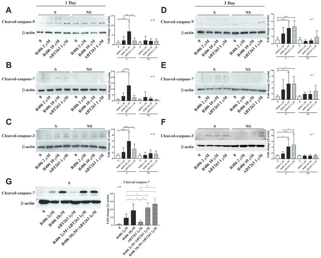 As in the example of the combination of dasatinib and quercetin in which senolytic effect is potentiated [17], we additionally tested the additive senolytic effect of R406 with ABT263. Interestingly, the expression of cleaved-caspase-7 was more induced by co-treating with R406 (2 μM or 10 μM) and ABT263 (1 μM) than by individual treatment of R406 or ABT263 (Figure 3G), which indicates that R406 and ABT263 might have different modes in cell death activation and R406 with combination of other senolytic drugs could potentiate senescent cell death selectively.