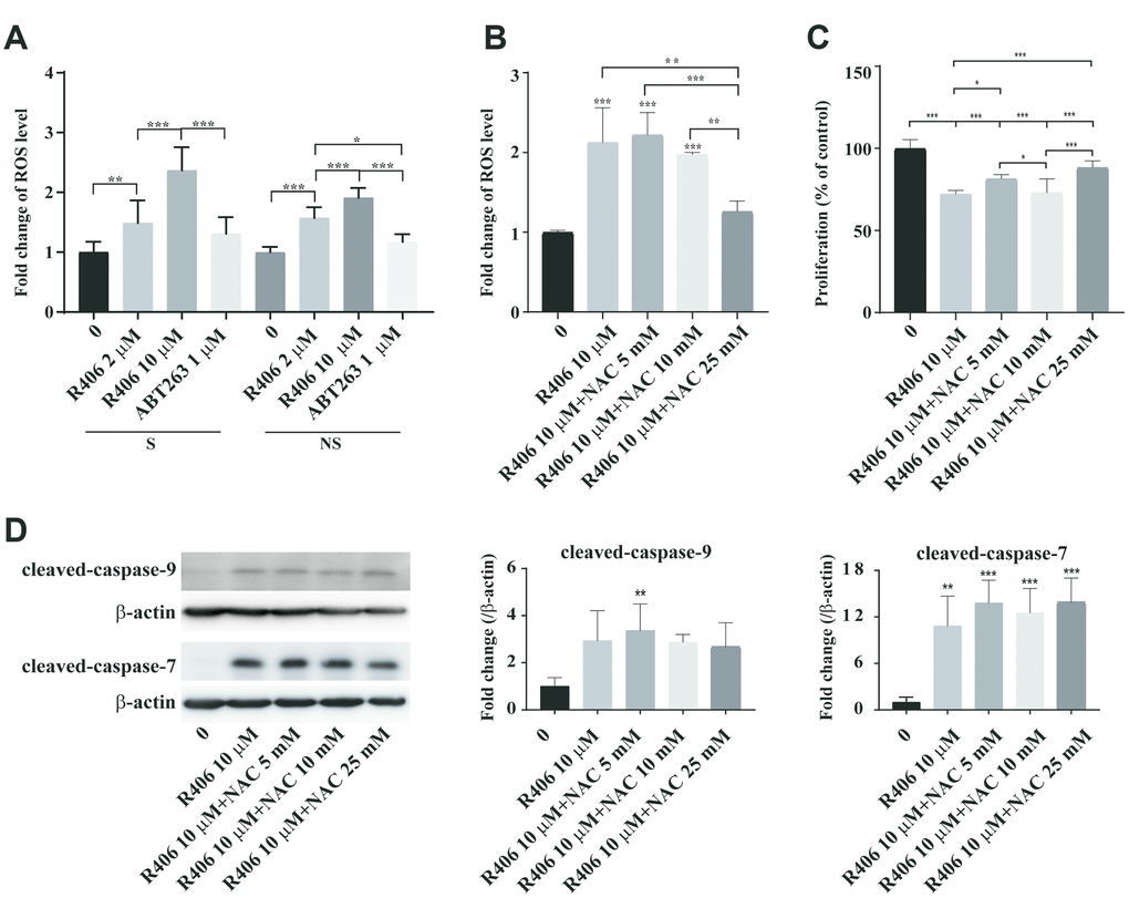 Next, we examined how R406 triggers apoptosis in senescent cells. Recent studies show that R406 induces ROS-dependent apoptotic effects via Syk-dependent and independent mechanisms in glioma stem cells [29]. For that reason, we tested whether R406 induces apoptosis via ROS generation in senescent HDFs. R406 induced ROS levels in a dose-dependent manner (Figure 4A). Notably, at 10 μM of R406, higher ROS levels were observed in senescent cells than in non-senescent cells (Figure 4A). However, R406 suppressed phosphorylation of Syk regardless of cell’s senescence state (Supplementary Figure 5). In order to check the relationship between R406-mediated ROS generation and apoptosis of senescent cells, we tested the R406-induced apoptotic effect in the presence of an antioxidant, N-acetyl-L-cysteine (NAC). We confirmed that 25 mM of NAC reduced about 70% of R406-mediated ROS generation (Figure 4B). Interestingly, NAC reduced R406-induced cytotoxicity in senescent HDFs in a statistically significant manner (Figure 4C). However, the level of cleaved-caspase-9 and -7 was not changed in R406 treated senescent HDFs even in the presence of NAC (Figure 4D). These results indicate that R406-dependent ROS generation would be a factor in senescent cell death, even though it might not involve apoptosis in senescent cells.