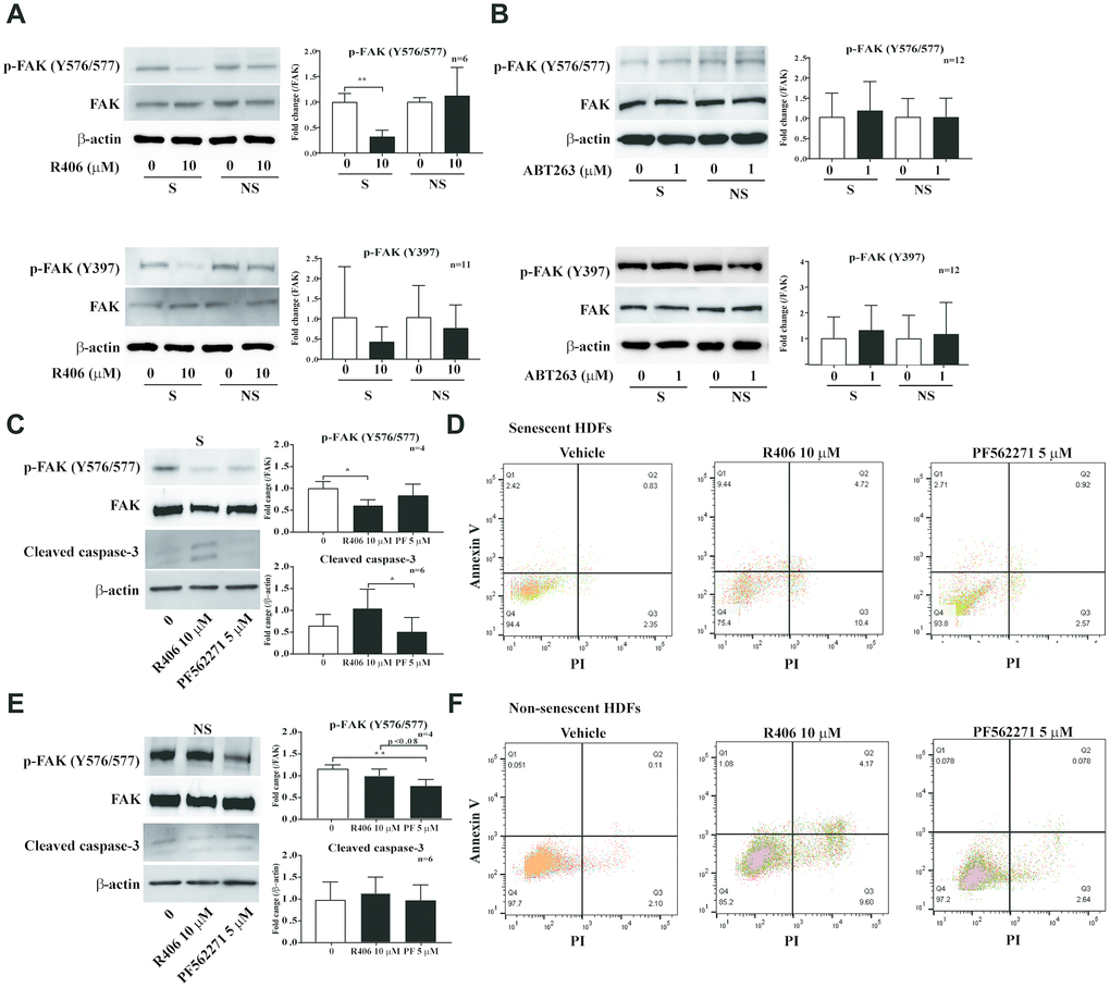 Cell survival is regulated by various signal pathways that are controlled by protein kinases [30–35]. Previous studies showed that FAK, a key molecule for cell adhesion, is critical for cell survival; blocking the FAK pathway increases the loss of substrate adhesion and induction of apoptosis of anchorage-dependent cells [36, 37]. Notably, our observation regarding live cell imaging led us to hypothesize that R406 induces morphological change in senescent cells via decreased cell adhesion. To validate this hypothesis, we checked the phosphorylation of FAK after short-term exposure to senolytic drugs. R406 altered the phosphorylation of FAK levels only in senescent HDFs (Figure 5A), whereas ABT263 did not change the phosphorylation of FAK. (Figure 5B). We then examined whether R406 affects the apoptotic effect on senescent cells via FAK signaling. Senescent and non-senescent HDFs were treated with a DMSO or a FAK inhibitor, PF562771, for one day and the expression of cleaved-caspase-3 and staining of annexin V/PI measured. Contrary to our expectations, the FAK inhibitor did not induce either the cleaved-caspase-3 expression or an apoptotic effect in HDFs (Figure 5C–5F). These results imply that R406-mediated FAK dephosphorylation would be one of the critical factors for inducing senescent cell death; however, FAK inactivation would not be a sole causality for the apoptosis of senescent cells.