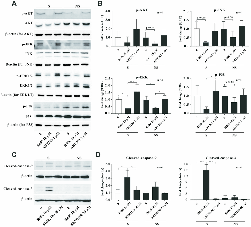 Mitogen-activated protein kinases (ERK, JNK, and p38) and AKT mediate cell survival and death signals, which are stimulated by a diverse range of cytokine, growth factor, and chemical agents in mammalian cells [30–35]. Thus, we studied whether the senolytic effect of R406 is related to the MAPKs and AKT signaling pathways. The results showed that phosphorylation of AKT, JNK, and ERK was inhibited by R406, regardless of cellular senescence. Interestingly, p38 phosphorylation was more inhibited by R406 in senescent cells than non-senescent cells (Figure 6A, 6B). However, a p38 inhibitor, SB202190, did not stimulate cleaved-caspase-9 and -3 (Figure 6C, 6D). These results also indicate that the R406-mediated p38 dephosphorylation might be associated with senescent cell death, but p38 inactivation would not be the only reason for apoptosis of senescent cells.