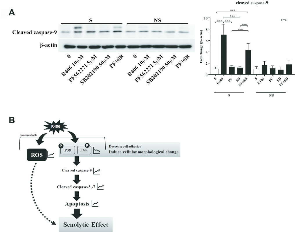 Next, we checked whether R406 alters phosphorylation of JNK and p38. Among them, R406 strongly inhibited the phosphorylation of p38 in senescent cells, in contrast to its actions in non-senescent cells (Figure 6A and 6B). Similar to the FAK inhibitor, p38 inhibitor (SB202190) alone did not stimulate cleaved-caspase-9 and -3 (Figure 6C and 6D). This observation implies that R406-induced p38 dephosphorylation would also be associated with senescent cell death, but that p38 inactivation could not solely trigger apoptosis of senescent cells. Interestingly, co-treatment with the FAK inhibitor and p38 inhibitor resulted in the cleavage of caspase-9, specifically in senescent cells (Figure 7A). These observations together with R406-induced kinase inhibition allow us to propose a working model for R406 as a senolytic whereby the drug-induced cell death is mediated by inhibiting FAK and p38 activity as well as increasing ROS (Figure 7B).