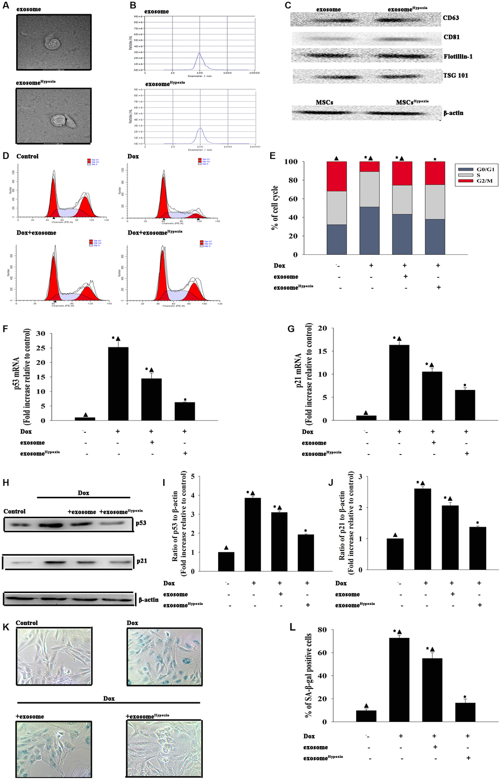 Considering the promoting effect of hypoxia preconditioning, the present study evaluated whether exosomes secreted by MSCs pretreated with hypoxia (exosomehypoxia) showed a more cardioprotective effect. First, the exosomes were isolated from the MSCs and MSCs treated with hypoxia as described earlier. Transmission electron microscopy (TEM) showed that exosomes exhibited a round-shaped morphology and a size of 50–100 nm. Moreover, the presence of the exosomal markers CD63, CD81, Flotillin-1, and Tsg101 was confirmed by Western blot analysis (Figure 1A–1C). No difference in concentration was reported between exosome and exosomehypoxia, confirmed by nanoparticle tracking analysis (NTA). Then, the effects of exosomehypoxia on Dox-induced cardiomyocyte senescence were determined. The results revealed that compared with Dox-treated cardiomyocytes, exosomehypoxia protected cardiomyocytes from senescence, showing that more cells escaped from the G0/G1 phase as measured using FACS (Figure 1D, 1E), with the decreased expression of the cellular senescence–related genes p53 and p21 (Figure 1F–1J) and a lower percentage of SA-β-gal-positive cells (Figure 1K, 1L). In the meanwhile, exosomes from MSCs without any treatment also elicited cellular rejuvenation to some extent, which was not significant compared with the exosomeHypoxia, indicating that hypoxia-preconditioned increased the cellular rejuvenation effect of exosomes.