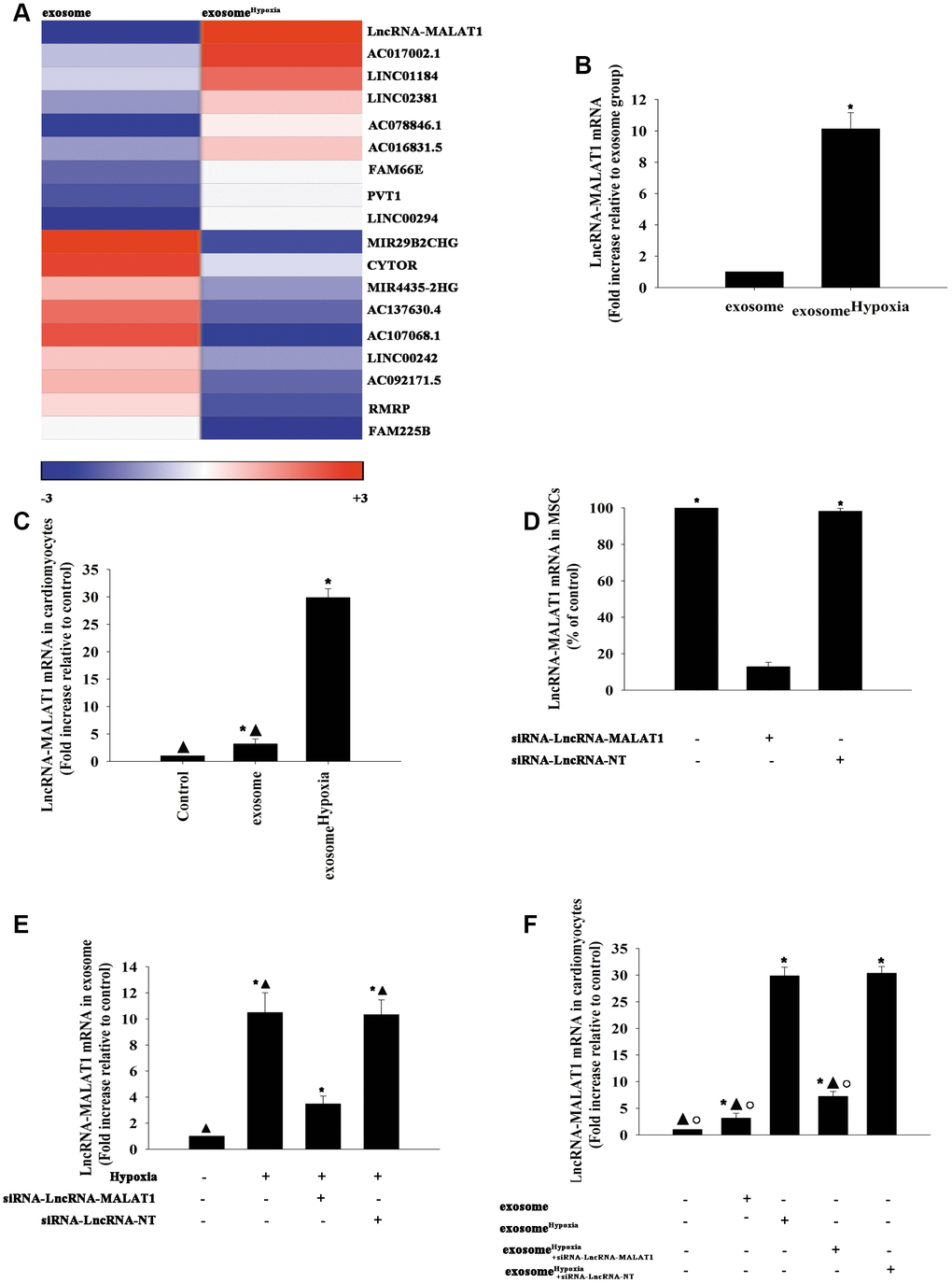 To assess the main biological pathways influenced by exosomeHypoxia, lncRNA analysis by microarray was conducted on MSC- and MSCHypoxia -derived exosomes. Genes significantly upregulated and downregulated in the exosomeHypoxia group compared with the exosome group were identified. The maximum difference was for the lncRNA-MALAT1, a hypoxia-inducible lncRNA, which was confirmed by qRT-PCR (Figure 2A, 2B). To confirm whether this lncRNA could be transferred to the cardiomyocytes through exosomes, the lncRNA-MALAT1 mRNA was detected in the cardiomyocytes incubated with exosomeHypoxia or exosome, compared with cardiomyocytes without any treatment. As expected, the lncRNA-MALAT1 showed the strongest upregulation in cardiomyocytes incubated with exosomeHypoxia, but also a little upregulation in the exosome group (Figure 2C). Furthermore, the expression of the lncRNA-MALAT1 in MSCs was silenced. The qRT-PCR results confirmed that the silencing of the lncRNA-MALAT1 significantly decreased the expression of the lncRNA-MALAT1 in MSCs (Figure 2D). MSCs were transfected with siRNA against the lncRNA-MALAT1 or control siRNA-NT and were cultured under hypoxic conditions. After, the exosomes were collected. The LncRNA-MALAT1 mRNA in exosomes was examined using qRT-PCR, revealing that hypoxia increased lncRNA-MALAT1 generation, which was abolished by lncRNA-MALAT1 silencing (Figure 2E). Exosomes derived from MSCs, which were transfected with siRNA against the lncRNA-MALAT1 or control siRNA-NT and treated with hypoxia or treated only with hypoxia, or without any treatment, were added to cardiomyocytes. In parallel experiments, cardiomyocytes without any treatment were used as control. Then, lncRNA- MALAT1 mRNA in cardiomyocytes was examined by qRT-PCR. The results revealed that exosomeHypoxia transferred the lncRNA-MALAT1 to cardiomyocytes, while this transfer was blocked by endogenous lncRNA-MALAT1 silencing in MSCs (Figure 2F).