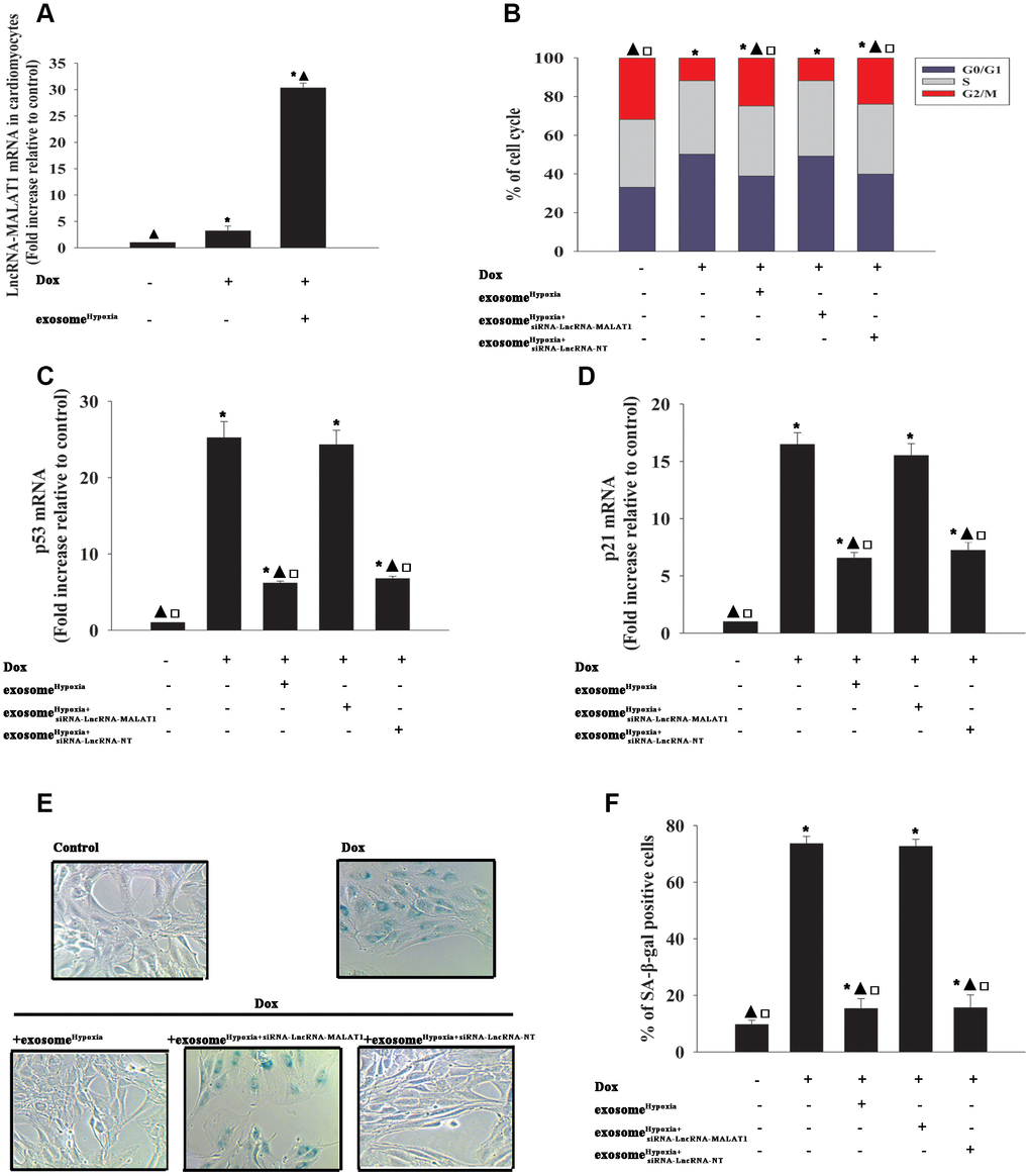 In the subsequent experiments, exosomes derived from MSCs, which were transfected with siRNA against the lncRNA-MALAT1 or control siRNA-NT and treated with hypoxia or treated only with hypoxia, were added after cardiomyocytes were treated with Dox. In parallel experiments, cardiomyocytes without any treatment were used as control. As shown in Figure 3A, Dox alone increased the expression of the lncRNA-MALAT1 slightly. Dox induced cardiac senescence, while exosomeHypoxia significantly reduced the percentage of G0/G1 phase cells (Figure 3B), expression of classical senescence-associated genes (Figure 3C and 3D), and number of SA-β-gal-positive cells (Figure 3E and 3F). This protective effect was abolished by silencing the lncRNA-MALAT1 in MSCs before treatment with hypoxia. These results strongly supported that exosomes derived from MSCsHypoxia exerted a rejuvenation effect partially through direct lncRNA-MALAT1 transfer.