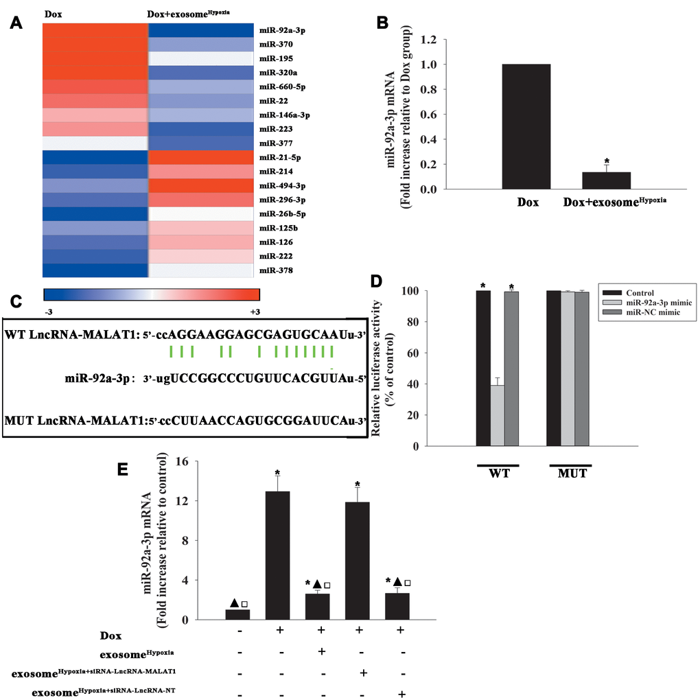 To investigate the functional molecules responsible for the rejuvenating effect of exosomeHypoxia, the miR expression levels of Dox-treated cardiomyocytes and exosomeHypoxia added into Dox-treated cardiomyocytes were analyzed using a microarray (Figure 4A). High levels of miR-92a-3p were detected in the Dox model compared with the Dox+ exosomeHypoxia group, which was confirmed by qRT-PCR (Figure 4B). Also, the bioinformatics database (Lncbase) was analyzed. MiR-92a-3p was identified as being capable of binding to complementary sequences in the lncRNA-MALAT1 (Figure 4C). The luciferase reporter assay was used to prove the prediction. The results showed that the lncRNA-MALAT1-wild type (WT) could significantly lower the luciferase activity in the miR-92a-3p mimic group, but had no significant effect on the luciferase activity in the miR-negative control (NC) mimic group (Figure 4D). To determine whether the expression of miR-92a-3p was downregulated by the lncRNA-MALAT1 induced by exosomeHypoxia, MSCs were transfected with the siRNA-lncRNA-MALAT1 or siRNA-lncRNA-NT and then subjected to hypoxia; the exosomes were collected. Dox-treated cardiomyocytes expressed a higher level of miR-92a-3p. However, the expression level of miR-92a-3p in Dox-treated cardiomyocytes substantially reduced when exosomeHypoxia was added. Exosomes derived from hypoxia-preconditioned MSCs with silenced lncRNA-MALAT1 could not alleviate the Dox-induced increase in the expression level of miR-92a-3p (Figure 4E).