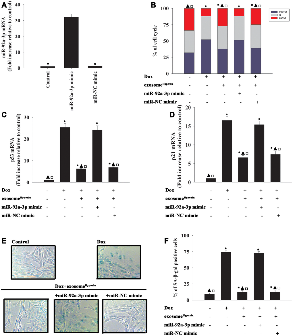 Considering the inhibitory action of the lncRNA-MALAT1 on the expression levels of miR-92a-3p in cardiomyocytes, the role of miR-92a-3p in the rejuvenating effects of exosomeHypoxia against Dox-induced senescence was further explored. Cardiomyocytes were transfected with a mimic control or the miR-92-3p mimic (Figure 5A) and treated with exosomeHypoxia and Dox. In parallel, cardiomyocytes treated or untreated with the exosomeHypoxia were treated with Dox. The untreated cardiomyocytes were used as control. Dox treatment increased the percentage of G0/G1 phase cells (Figure 5B), expression of classical senescence-associated genes p53 and p21 (Figure 5C, 5D), and the number of SA-β-gal-positive cells (Figure 5E, 5F), indicating that Dox treatment induced cellular senescence. ExosomeHypoxia alleviated Dox-induced cellular senescence, while transfection with an miR-92a-3p mimic further aggravated cell damage (Figure 5B–5F).