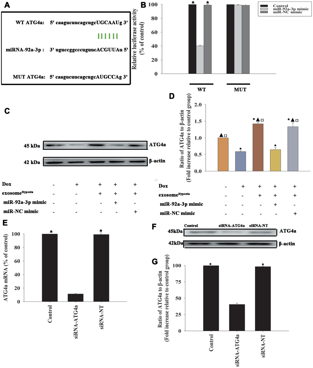 To identify the target genes of miR-92a-3p regulation, the bioinformatics database was used to speculate a putative binding site between miR-92a-3p and ATG-4a (Figure 6A), which was confirmed by dual-luciferase gene reporter assay. The relative luciferase activity was significantly weakened in the WT ATG4a + miR-92a-3p mimic group (Figure 6B). To investigate the inhibition effect of miR-92a-3p on ATG4a expression, the cardiomyocytes were transfected with an miR-92a-3p mimic or an miR-NC mimic, treated with exosomeHypoxia, and then subjected to Dox; the untreated cardiomyocytes were used as control. As expected, Dox treatment markedly inhibited ATG4a expression in cardiomyocytes, while exosomeHypoxia rescued the expression of ATG4a. In addition, extra miR-92a-3p impaired the expression of ATG4a (Figure 6C, 6D). These data suggested that ATG4a were genuine targets of miR-92a-3p.