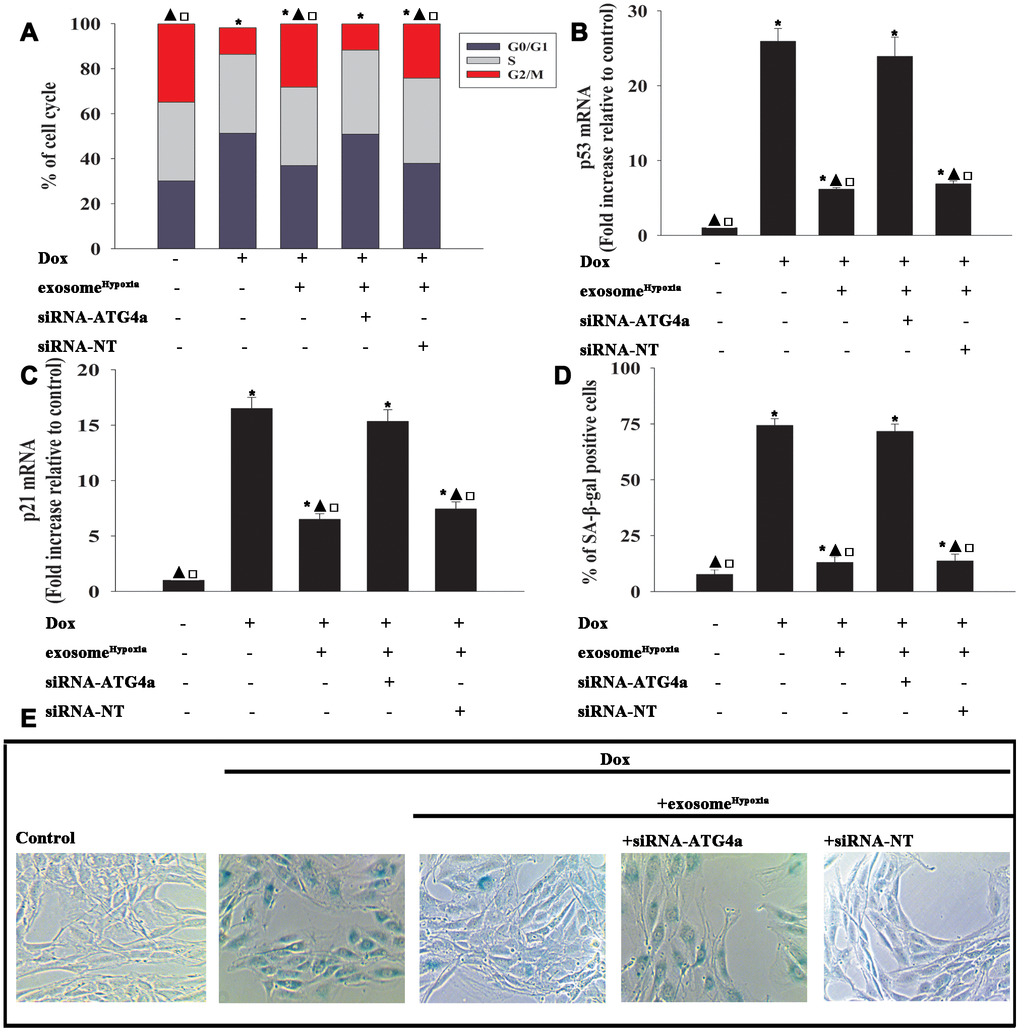 To explore the role of ATG4a in exosomeHypoxia-induced rejuvenation against Dox, ATG4a in cardiomyocytes was silenced by siRNA, and this caused a reduction in the expression of ATG4a, confirmed by qRT-PCR (Figure 6E) and Western blot analysis (Figure 6F, 6G). The cardiomyocytes were transfected with siRNA-ATG4a or siRNA-NT as control, treated with exosomeHypoxia, and subjected to Dox. In parallel, cardiomyocytes treated or untreated with exosomeHypoxia were subjected to Dox. The untreated cardiomyocytes were used as control. ATG4a knockdown restored the pro-senescent effects of Dox inhibited by exosomeHypoxia and increased the percentage of G0/G1 phase cells (Figure 7A), expression of classical senescence-associated genes p53 and p21 (Figure 7B, 7C), and number of SA-β-gal-positive cells (Figure 7D, 7E).
