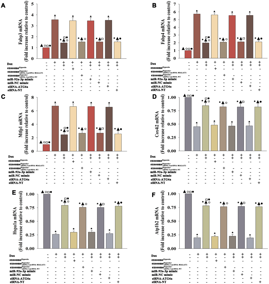 Cardiomyocytes showed a profound metabolism disruption during the senescence process [25]. Therefore, this study aimed to gain insight into the improvement of exosomeHypoxia in mitochondrial metabolism. MSCs were transfected with siRNA against the lncRNA-MALAT1 or control siRNA-lncRNA-NT and then treated with hypoxia. The exosomes were collected and added to cardiomyocytes treated with Dox. The cardiomyocytes were transfected with miR-92a-3p mimic, miR-NC mimic, siRNA-ATG4a, or siRNA-NT; treated with exosomeHypoxia; and subjected to Dox. Cardiomyocytes, with or without exosomeHypoxia, were subjected to Dox. The untreated cardiomyocytes were used as control. The expression levels of fatty acid–binding proteins 3 and 4 (Fabp3 and Fabp4) (Figure 8A, 8B) and mitochondrial fission process 1 (Mtfp1) protein (Figure 8C) increased, while the expression levels of cytochrome c oxidase subunit 4I2 (Cox4i2) (Figure 8D), heat shock protein family A member 1A (Hspa1a) (Figure 8E), and ATPase Na+/K+ transporting subunit beta 2 (Atp1b2) (Figure 8F) decreased in cardiomyocytes treated with Dox. A significant reverse effect was noted when exosomeHypoxia was added. The expression levels of Fabp3, Fabp4, and Mtfp1 increased and the expression levels of Cox4i2, Hspa1a, and Atp1b2 decreased after lncRNA-MALAT1 knockdown, corresponding miR-92a-3p overexpression, or silencing of ATG4a (Figure 8A–8F), suggesting that the exosomeHypoxia-induced lncRNA-MALAT1/miR-92a-3p/ATG4a signaling pathway improved mitochondrial metabolism in Dox-treated cardiomyocytes.
