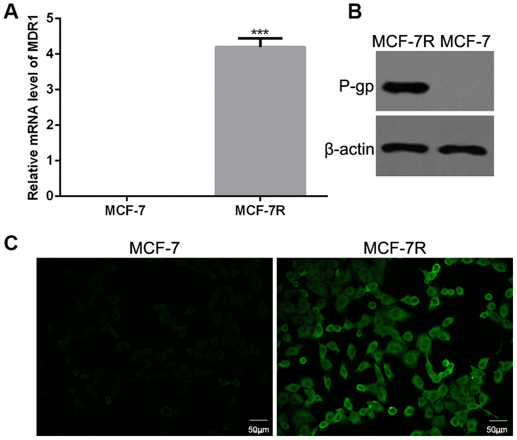 The mRNA and protein expression levels of P-gp were detected in MCF-7 and MCF-7R cells. The results of qRT-PCR showed that the mRNA level of MDR1 was highly expressed in MCF-7R cells but not MCF-7 cells (Figure 2A). Consistently, both western blotting (Figure 2B) and immunofluorescence (Figure 2C) revealed higher expression level of P-gp in MCF-7R cells than that in MCF-7 cells.