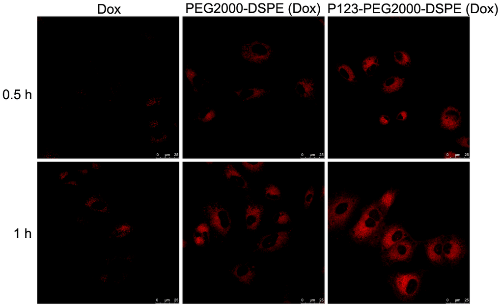 Based on confocal imaging analysis, we found the enhanced fluorescence intensity when cells were treated with PEG2000-DSPE (Dox) or P123-PEG2000-DSPE (Dox) compared with free Dox, especially, the strongest fluorescence intensity was found in cells treated with P123-PEG2000-DSPE (Dox) (Figure 3). These results indicated that the addition of P123 increased the cellular uptake of NMs. Moreover, the cellular uptake at 1 h of incubation time was higher than 0.5 h (Figure 3).