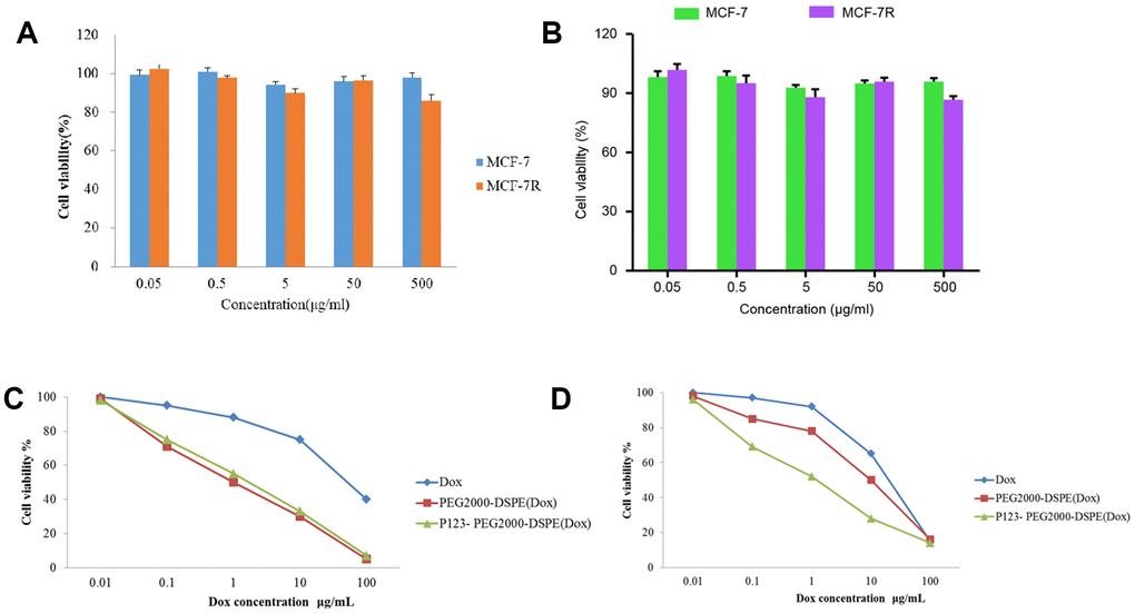To evaluate the cytotoxicity of PEG2000-DSPE (unloaded NMs), MCF-7 and MCF-7R cells were cultured in 96-well plates. On the next day, cells were then incubated with PEG2000-DSPE at different concentrations (ranging from 0.05 to 500 μg/mL) of Dox, respectively, for 24 h. Next, MTT (10 μL, Sigma, St Louis, MI, USA) was added to incubate with cells for 4 h, and dimethyl sulfoxide (150 μL, Sigma) was then used to dissolve formazan precipitates. Microplate spectrophotometer was used to evaluate cell viability based on the absorbances at 450 nm. Moreover, to investigate the anti-tumor proliferation activity of NMs, MCF-7 and MCF-7R cells were incubated with Dox, PEG2000-DSPE (Dox) and P123-PEG2000-DSPE (Dox) at different concentrations (ranging from 0.01 to 100 μg/mL) of Dox, respectively, for 24 h, and the cell viability was evaluated by MTT assay.